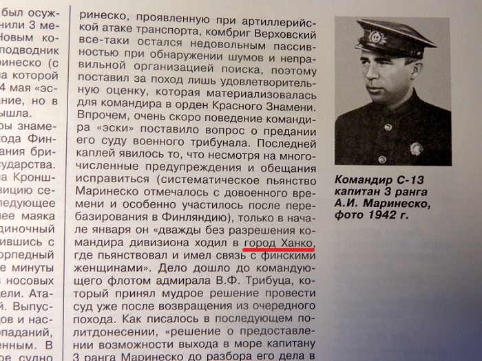О командире С-13 я тогда мало что знал. И из рассказа Г,В.Зеленцова услышал немного больше. О том что он родом из румын, что фамилия была бы соответствующая, Маринеску, но отец осевший в Одессе поменял её на украинский лад. О том, что в начале войны Маринеско был командиром "малютки" М-96, которая потом погибла. Вообще было видно, что Зеленцов беззаветно любит и уважает своего командира. В некоторые моменты рассказа его голос начинал дрожать и было видно, как на глаза старика наворачиваются слезы... Хотя, некоторые моменты жизни Маринеско носили довольно скандальный оттенок. Так, например, ветеран довольно подробно поведал о том как его командир по-гусарски провел новогоднюю ночь 45-го. Помню, что у многих присутствующих это вызвало снисходительные улыбки. Какая-то простигосподи, какая-то пьяная драка из-за неё, наряд патруля и т.д. Честно говоря не очень красиво, хотя кто не без греха.