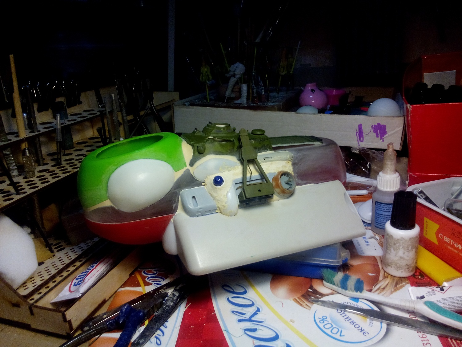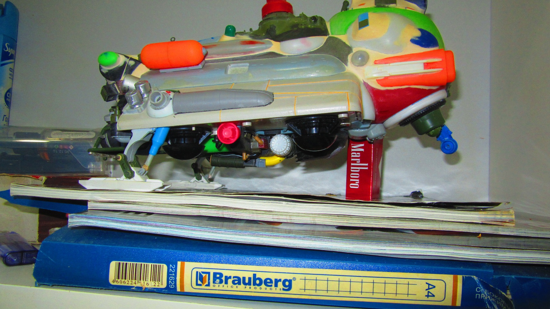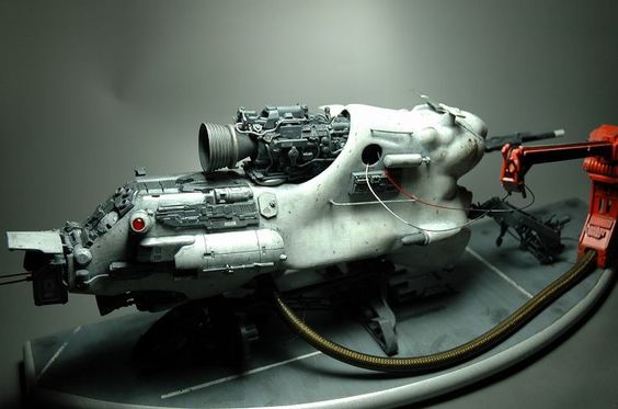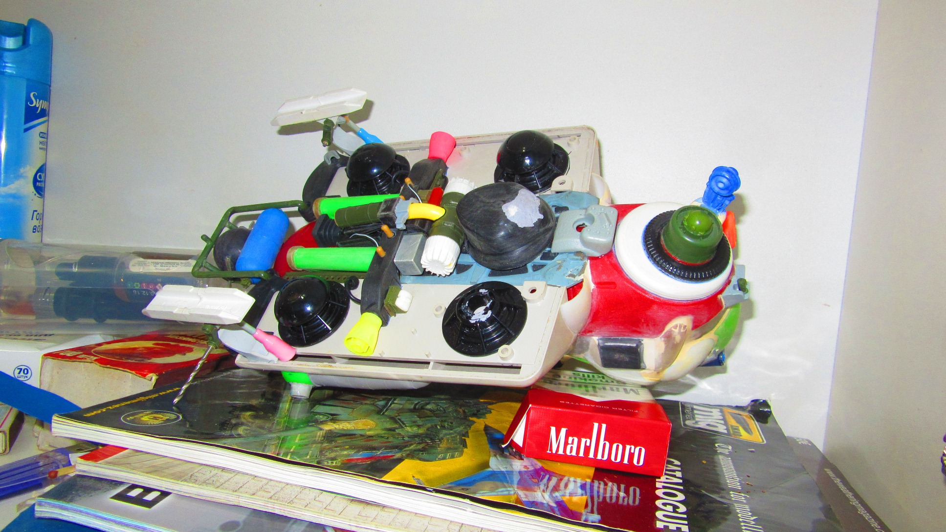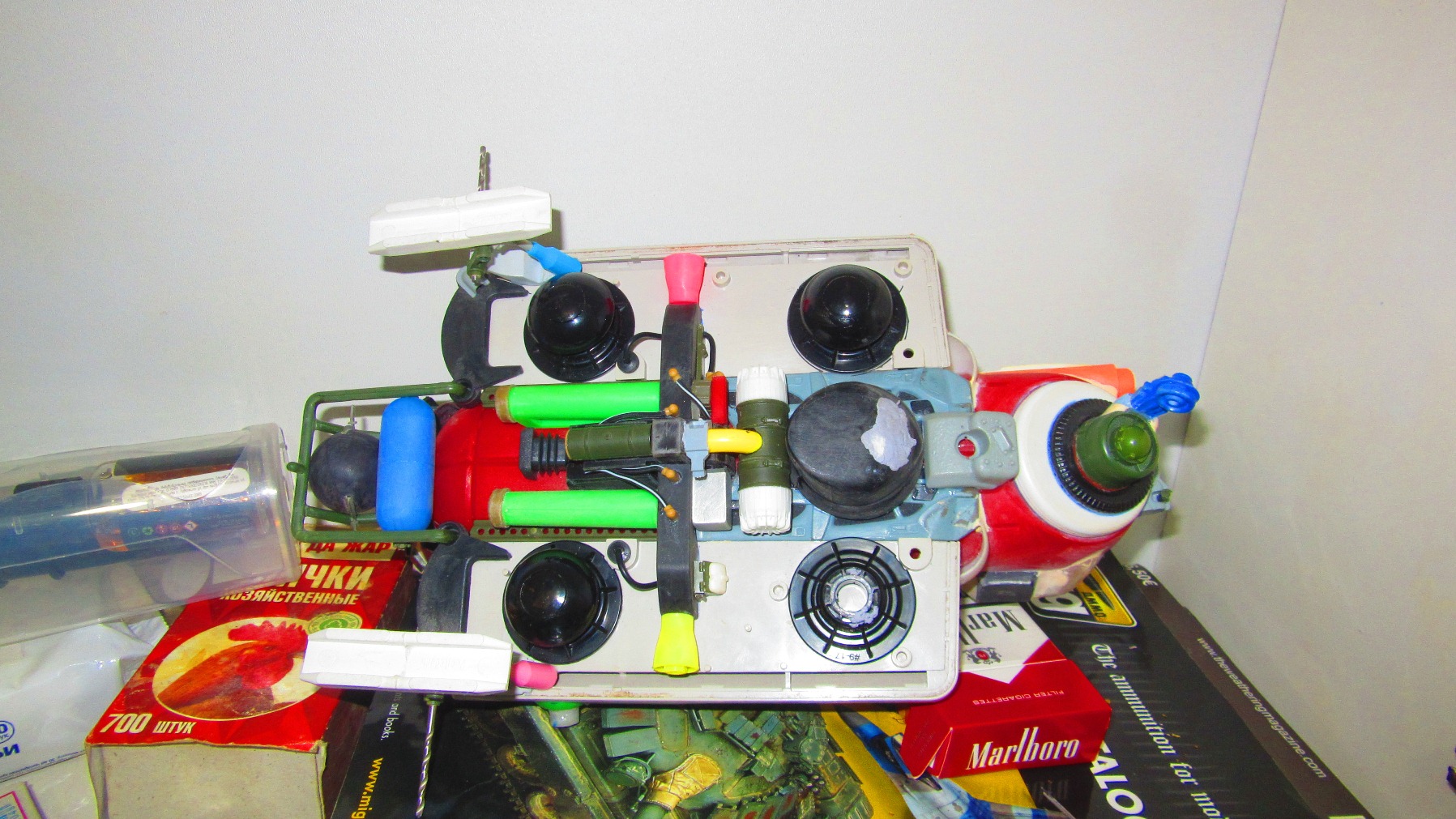 Берем все, что видим и начинаем складывать в кучку, соблюдакя некоторый стиль данной вселенной. Основа всей конструкции -контейнер для колбасы, купленный в супермаркетк за 100 рублей.Отсюда, собственно и название 8). Далее немного различных деталей и автошпаклевка. Вариантов компоновки перебрал много, Остановился на более-менее правдоподобном.