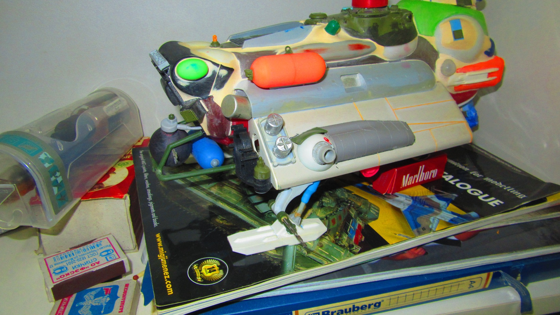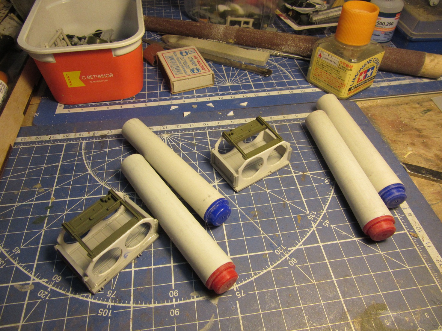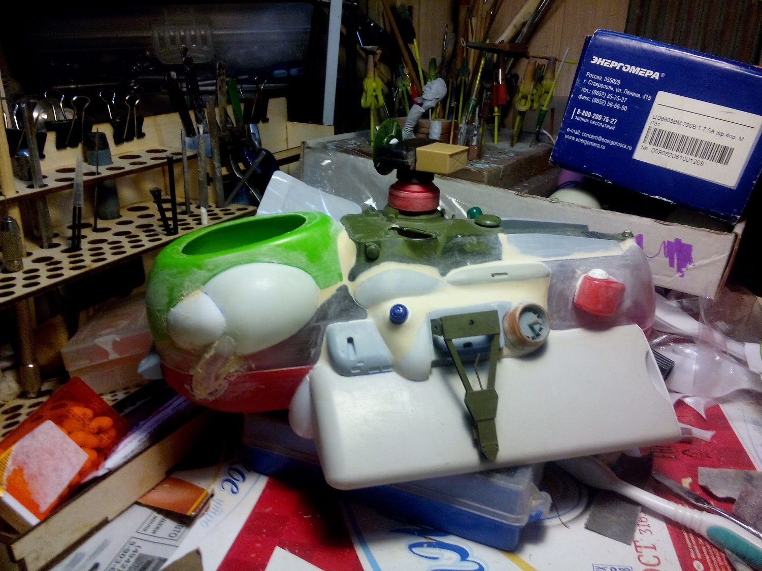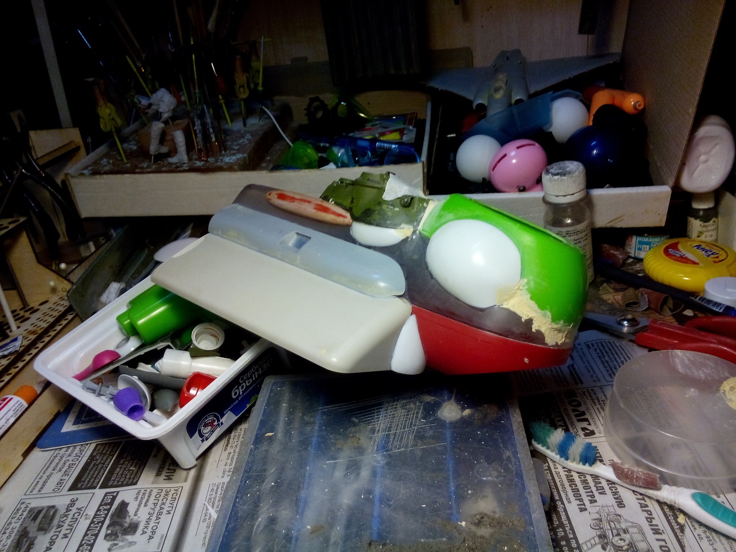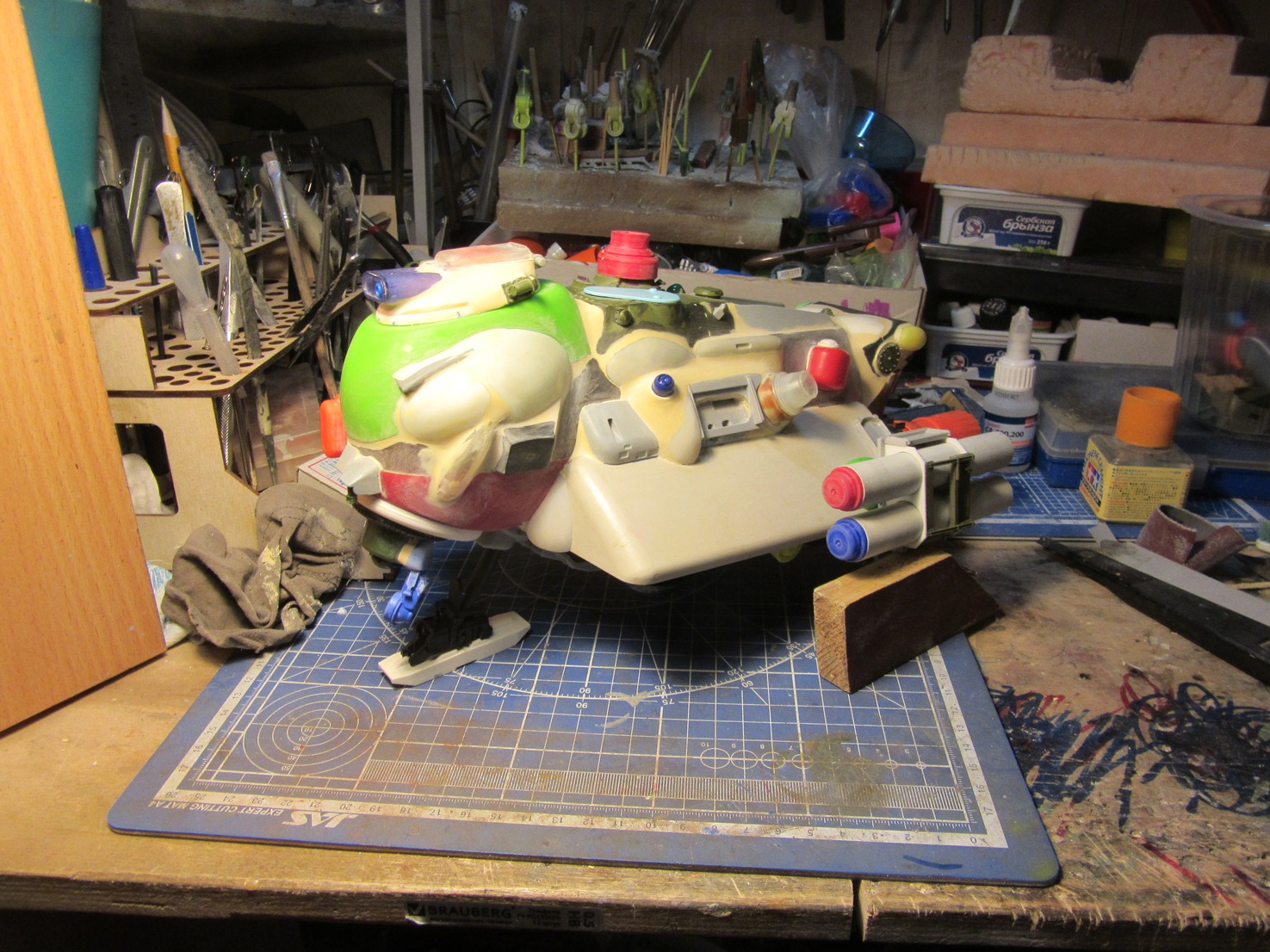 Берем все, что видим и начинаем складывать в кучку, соблюдакя некоторый стиль данной вселенной. Основа всей конструкции -контейнер для колбасы, купленный в супермаркетк за 100 рублей.Отсюда, собственно и название 8). Далее немного различных деталей и автошпаклевка. Вариантов компоновки перебрал много, Остановился на более-менее правдоподобном.