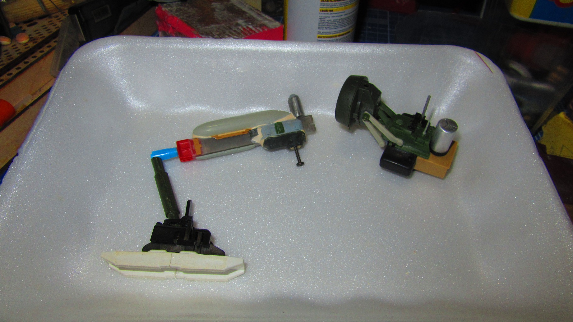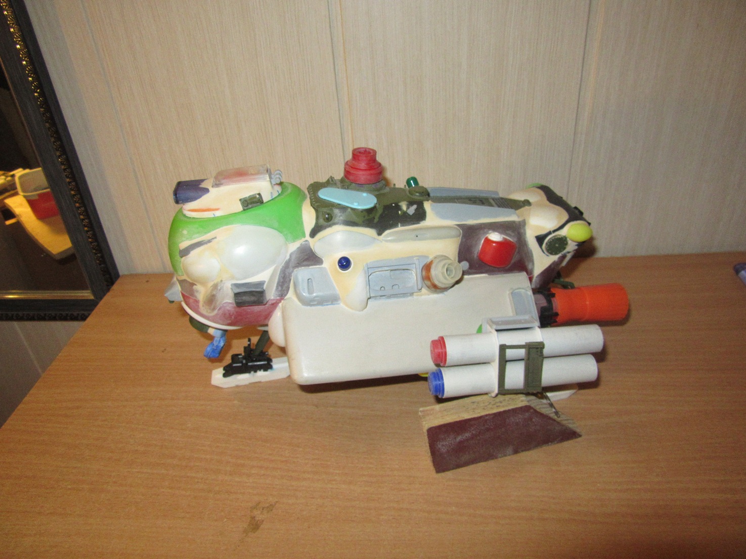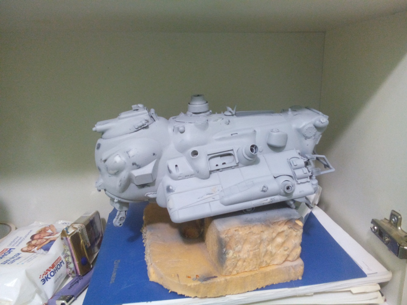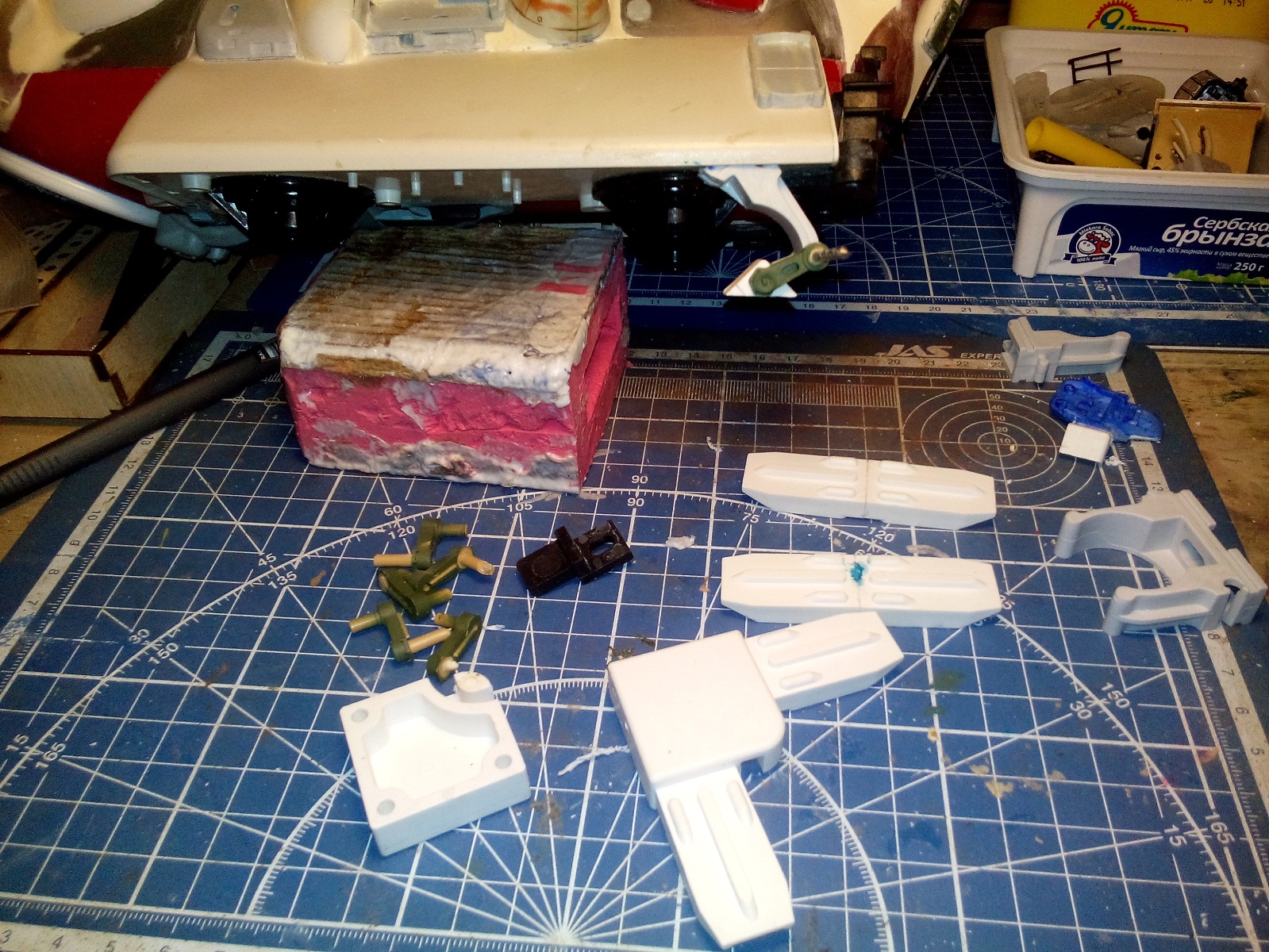 Берем все, что видим и начинаем складывать в кучку, соблюдакя некоторый стиль данной вселенной. Основа всей конструкции -контейнер для колбасы, купленный в супермаркетк за 100 рублей.Отсюда, собственно и название 8). Далее немного различных деталей и автошпаклевка. Вариантов компоновки перебрал много, Остановился на более-менее правдоподобном.