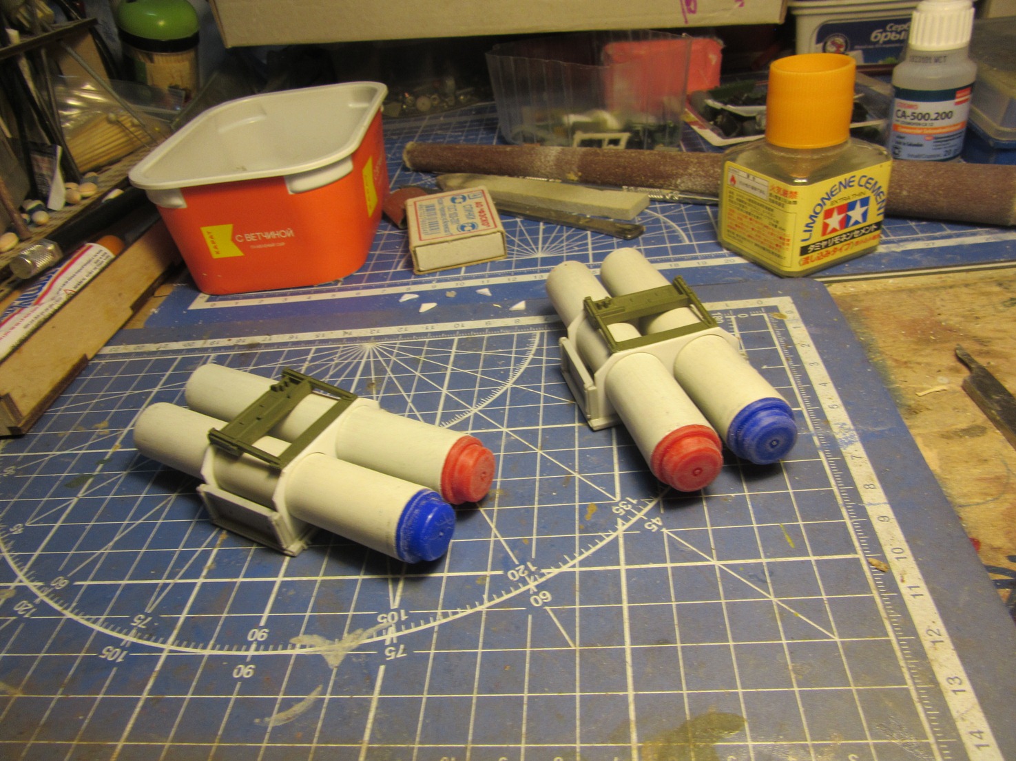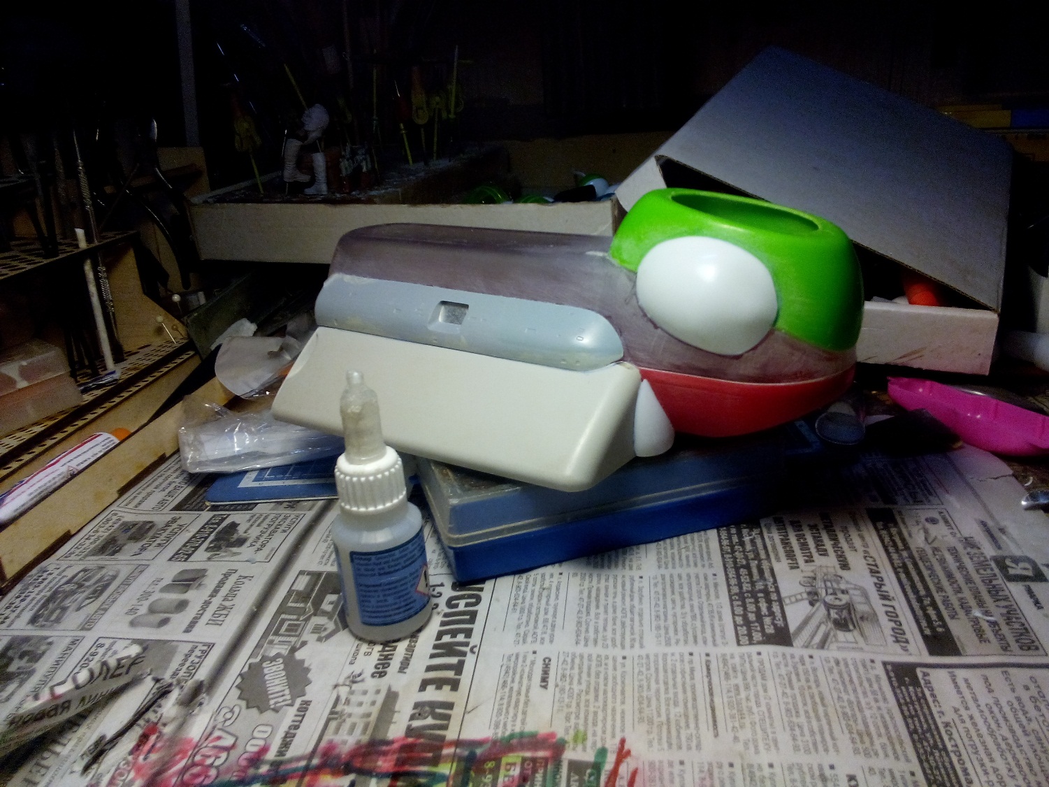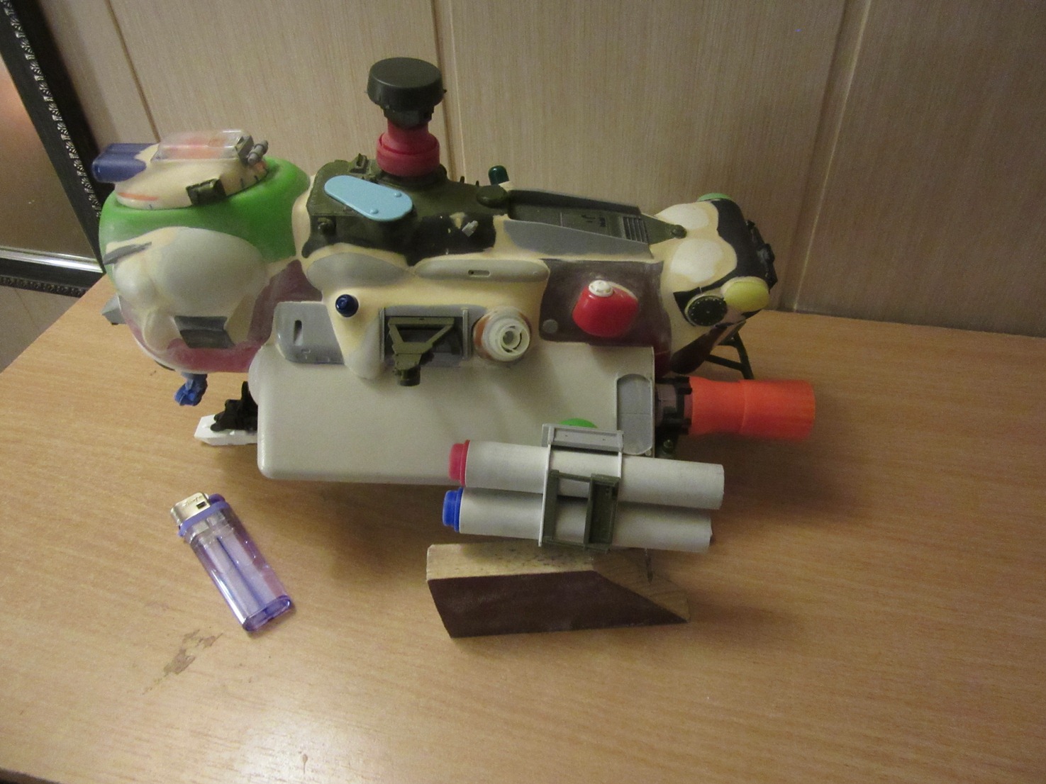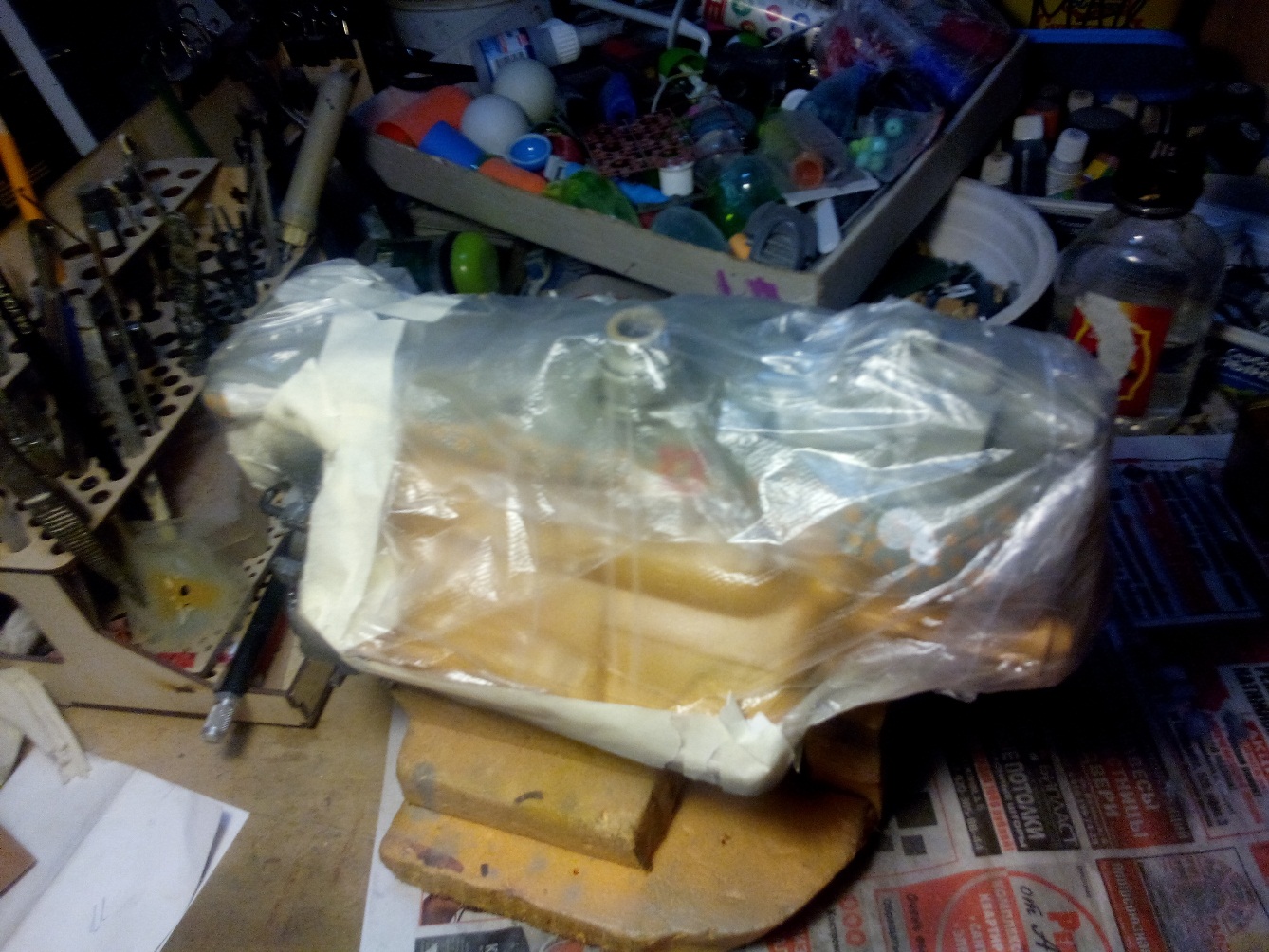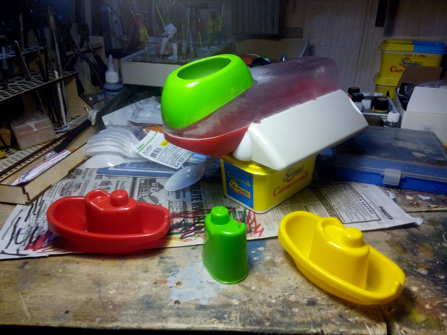 Берем все, что видим и начинаем складывать в кучку, соблюдакя некоторый стиль данной вселенной. Основа всей конструкции -контейнер для колбасы, купленный в супермаркетк за 100 рублей.Отсюда, собственно и название 8). Далее немного различных деталей и автошпаклевка. Вариантов компоновки перебрал много, Остановился на более-менее правдоподобном.
