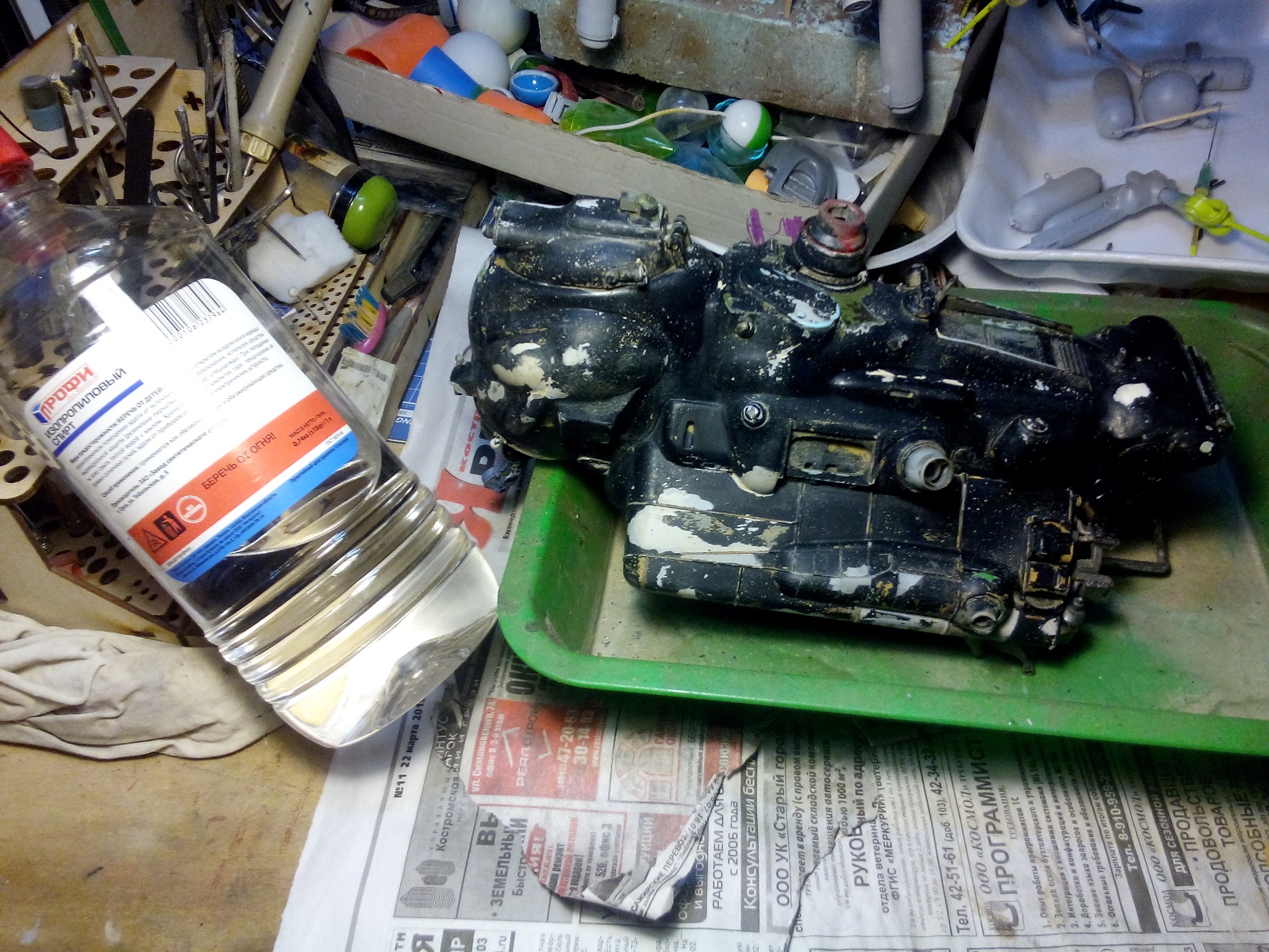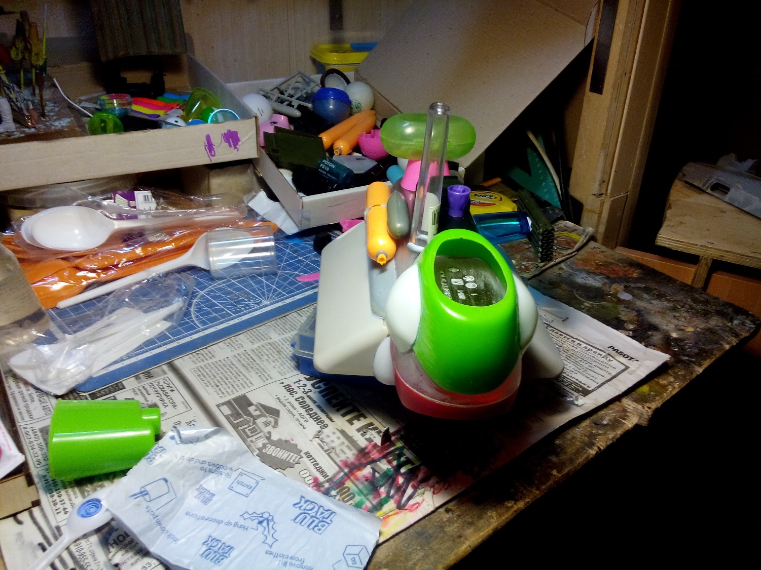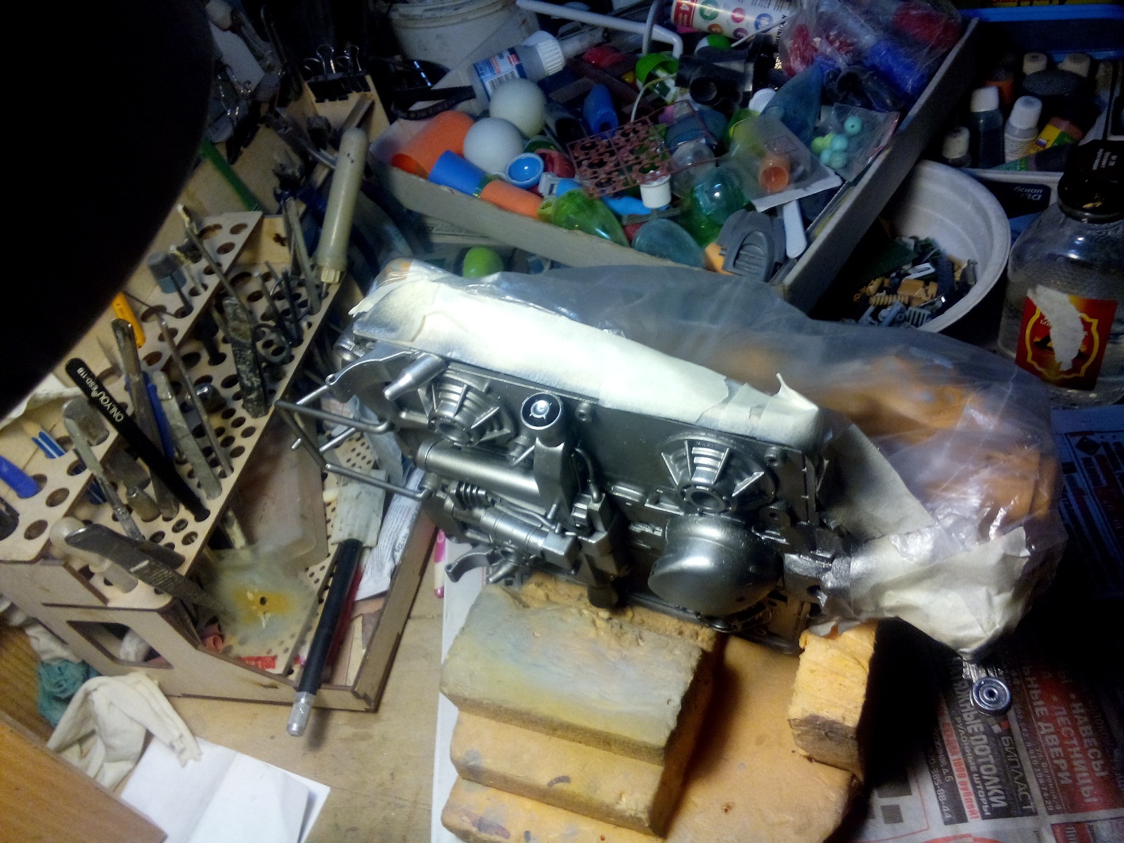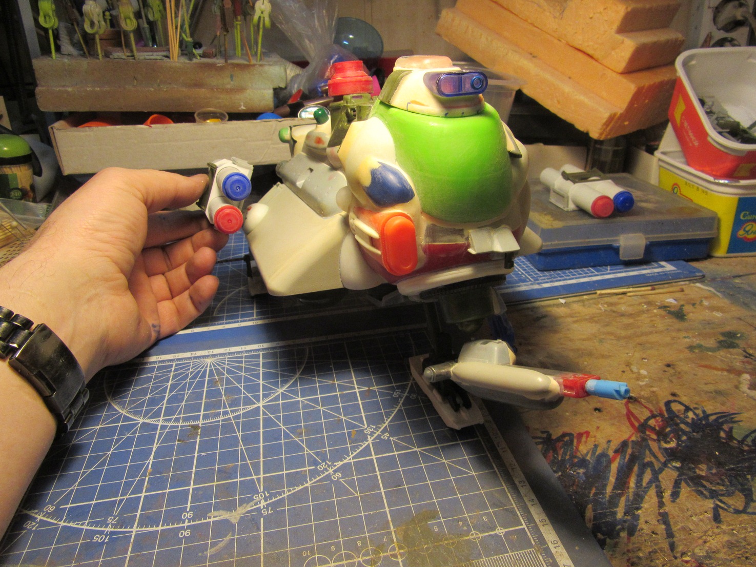 Берем все, что видим и начинаем складывать в кучку, соблюдакя некоторый стиль данной вселенной. Основа всей конструкции -контейнер для колбасы, купленный в супермаркетк за 100 рублей.Отсюда, собственно и название 8). Далее немного различных деталей и автошпаклевка. Вариантов компоновки перебрал много, Остановился на более-менее правдоподобном.