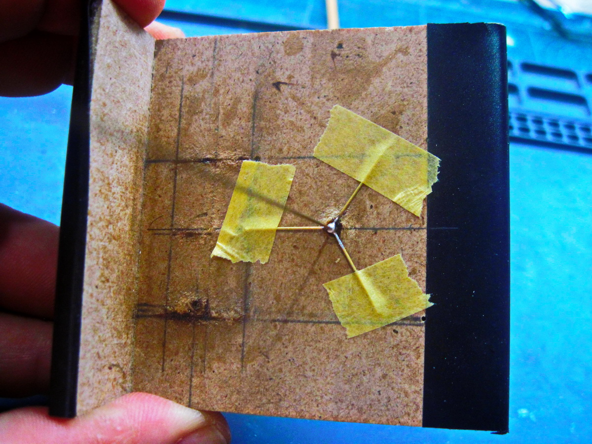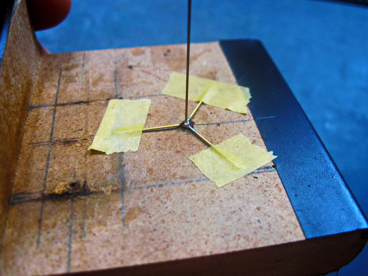 Собрал приспособу. В латунной трубке 1,5 мм просверлил отверстие под оси рукавов 0,5 мм. Спаял.