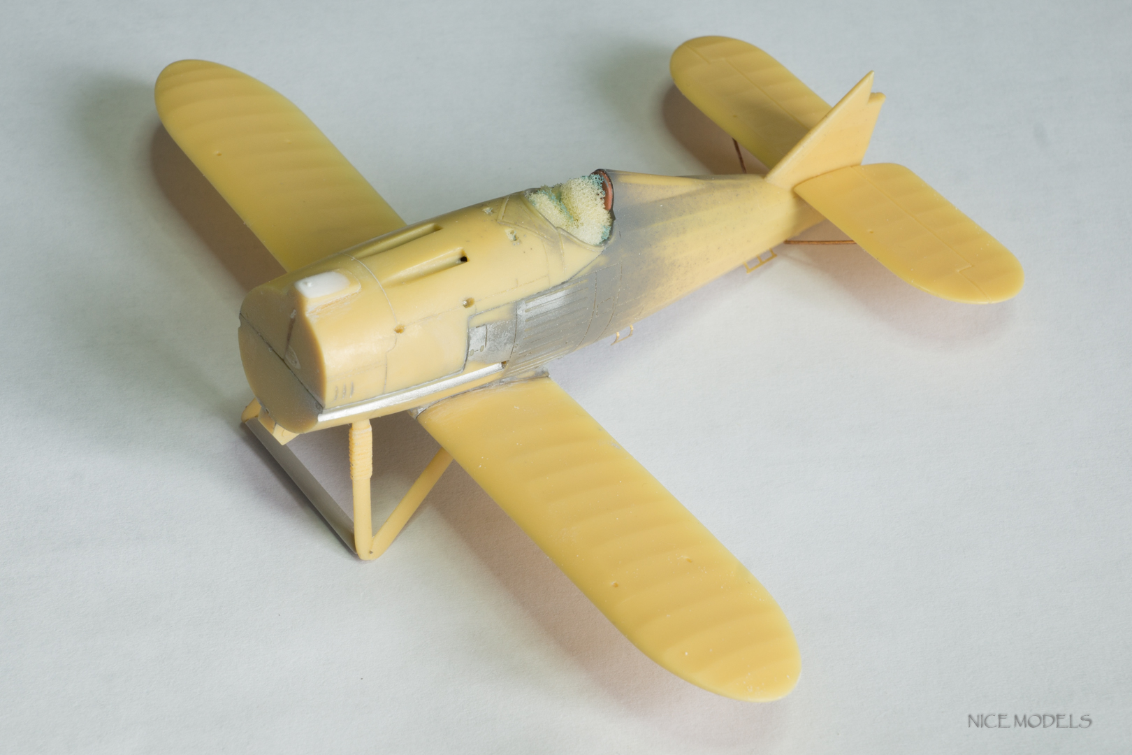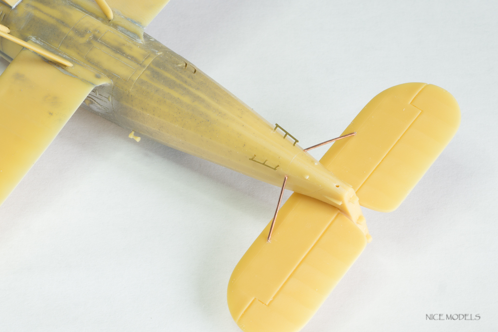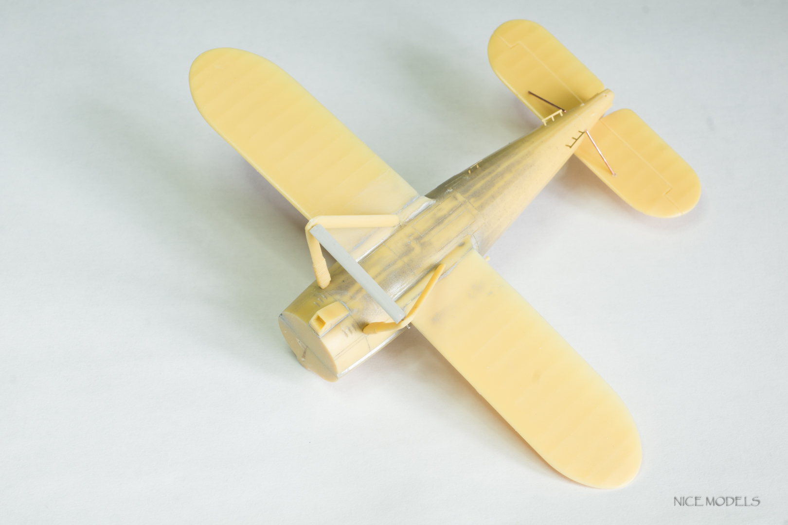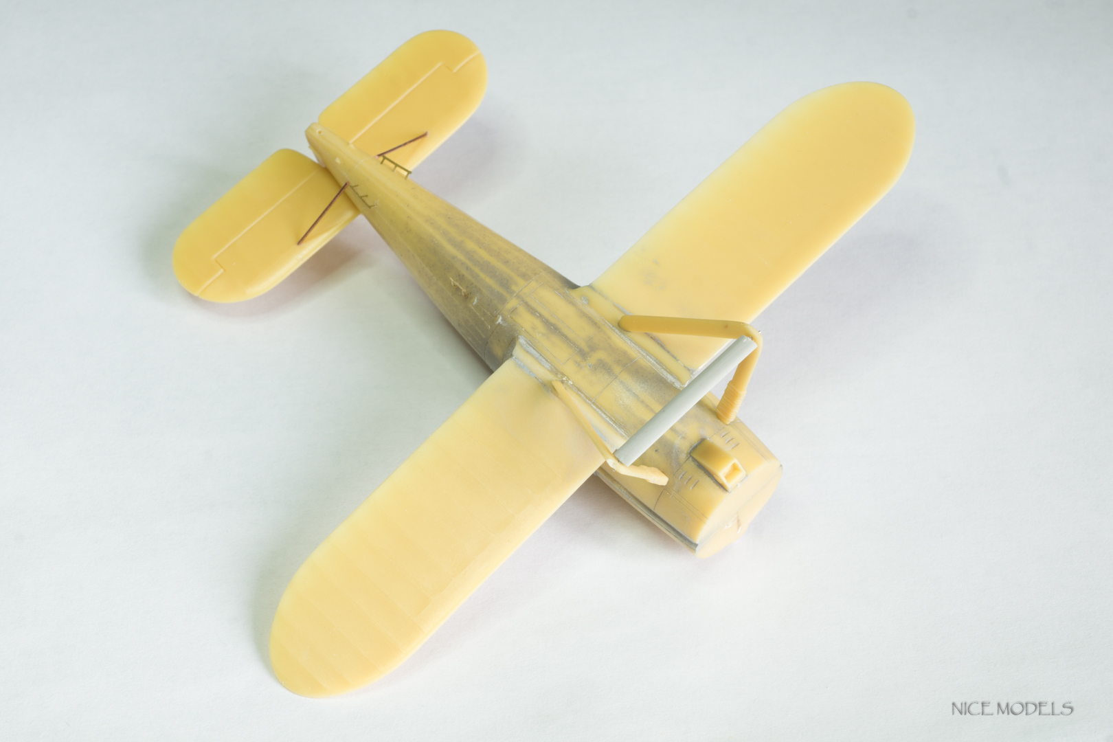 скорректировал форму маслобака и выточил из литника ось между стойками. добавил подкосы из проволоки на стабилизаторы и установил мелочевку. начал красить двигатель