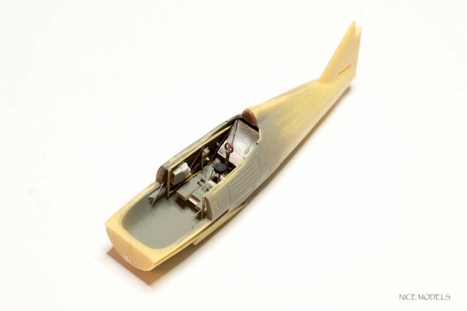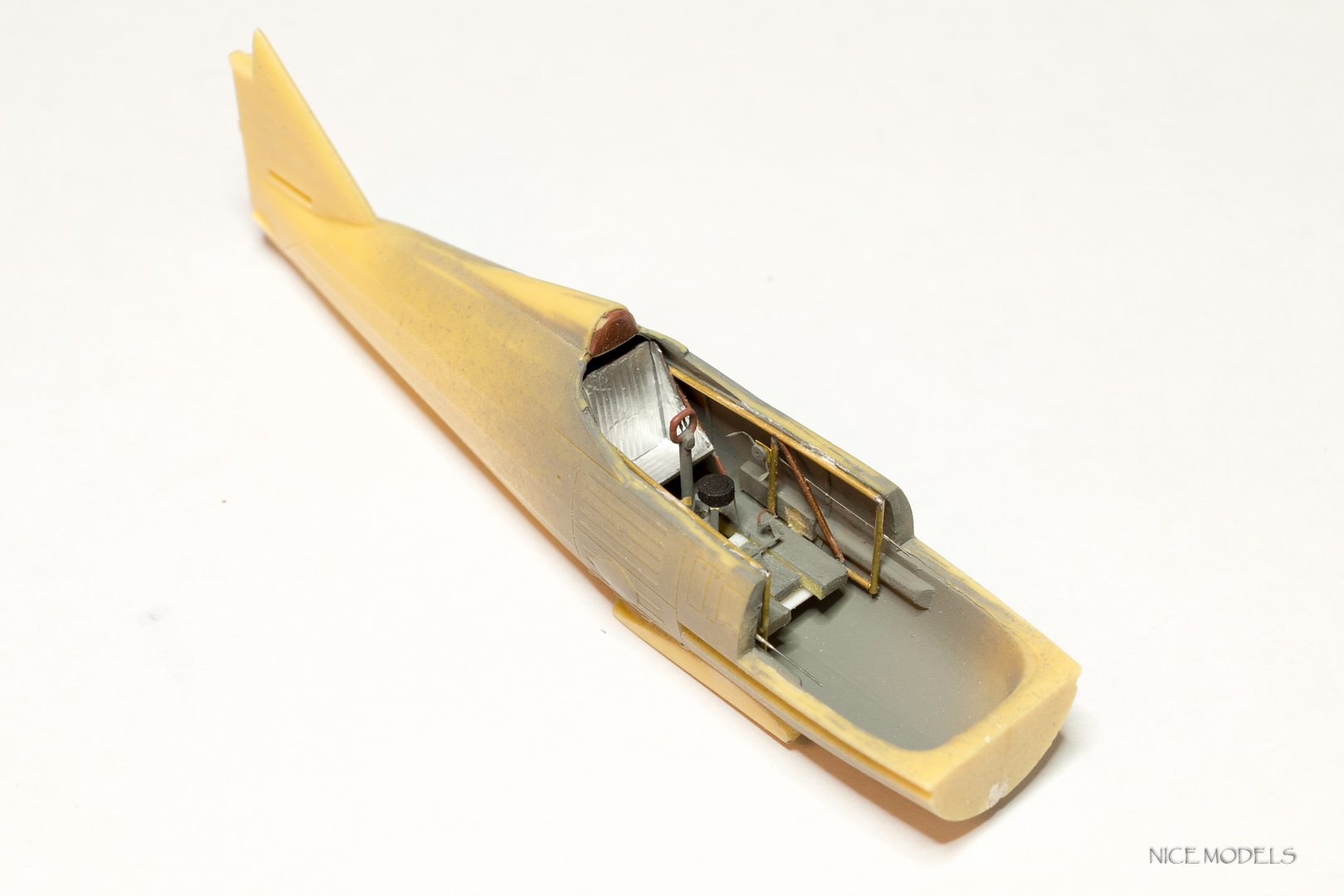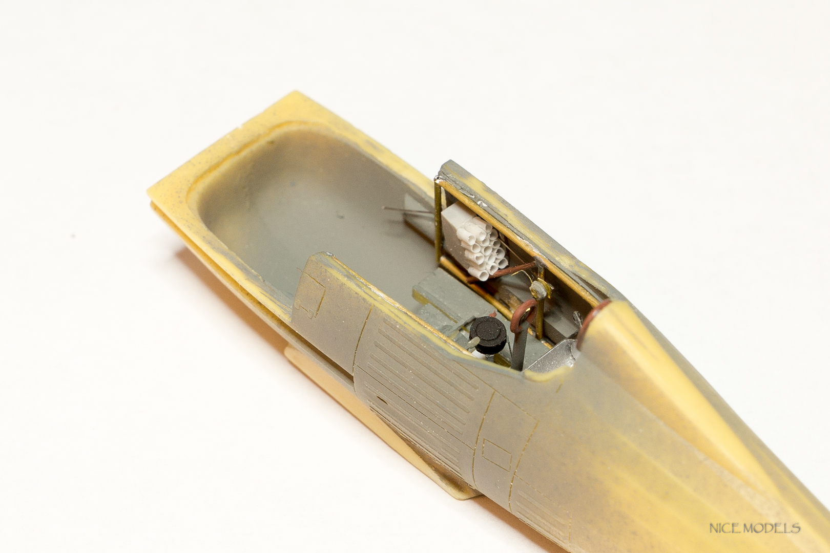 Немного доработал кокпит: из тянутых палочек сделал патронтаж, полик был распилен и педали с компасом подвинуты ближе к сиденью, из литника выточил кислородный баллон и поставил на него вентиль из травления, из фольги сделал имитацию гофры на сидушке, добавил рычаг регулировки сиденья, из латунных трубок спаял каркас т.к. травленый в наборе касячный.
