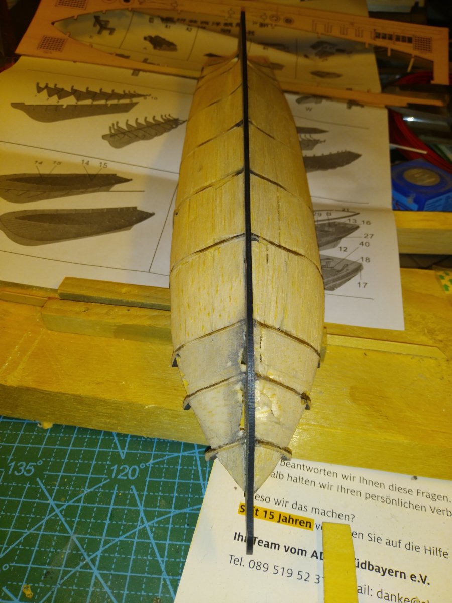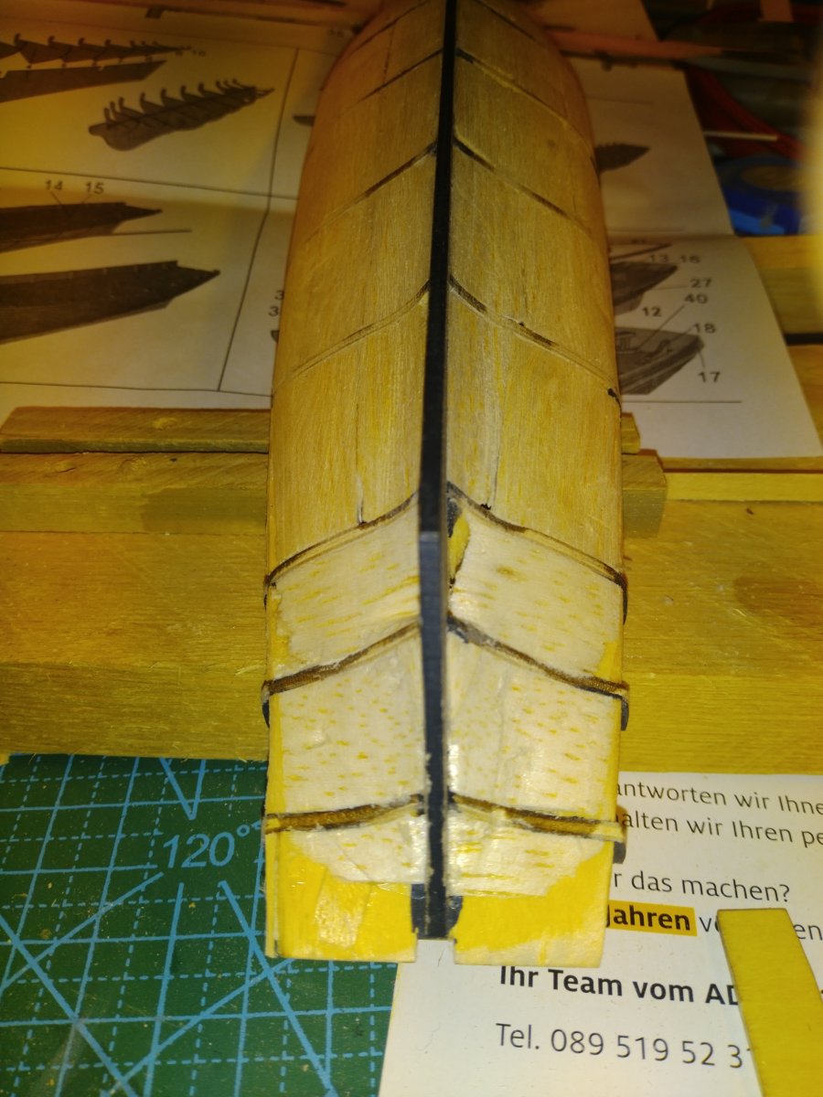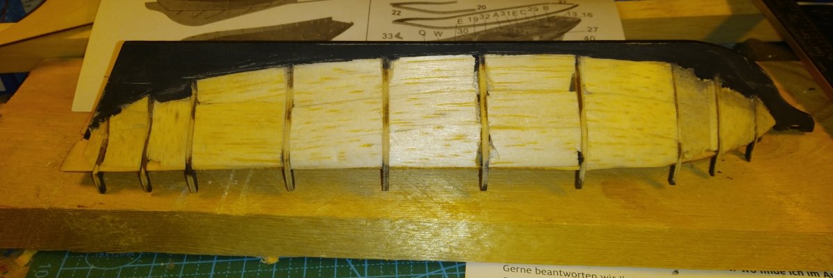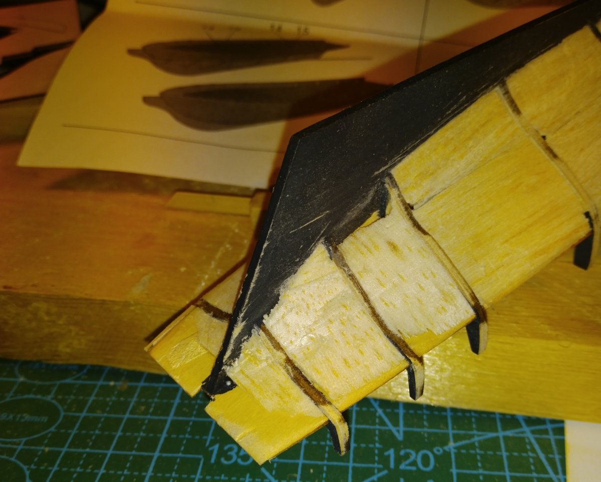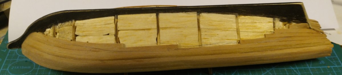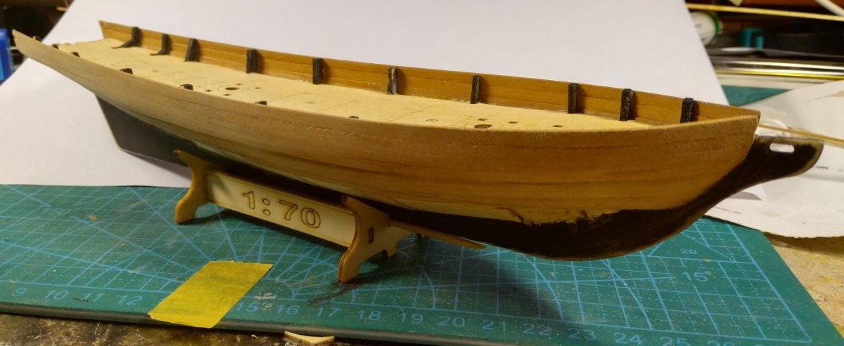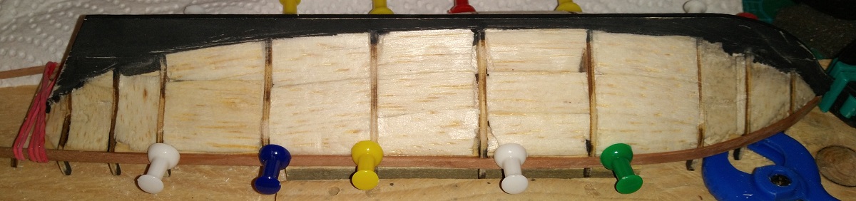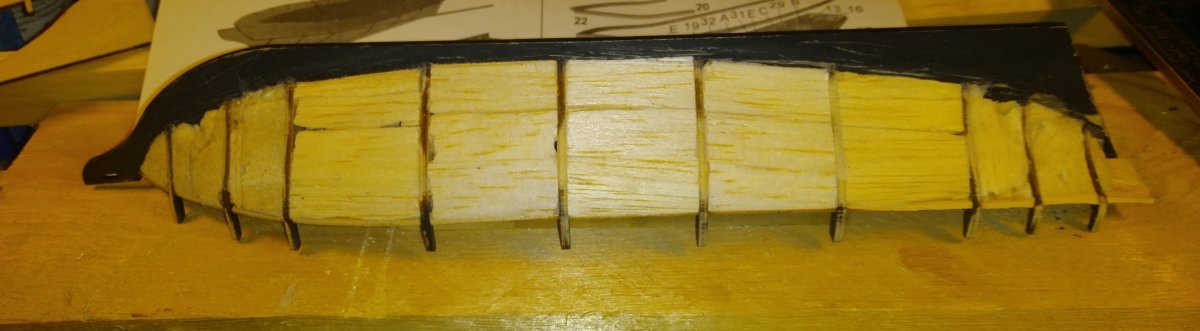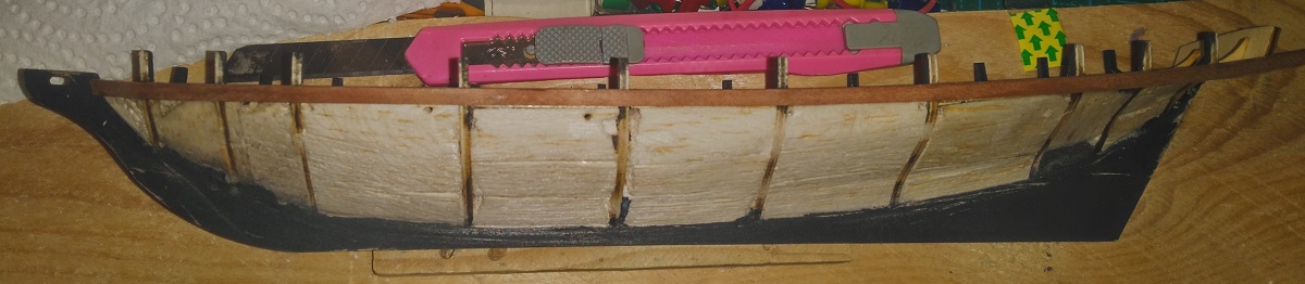 На бортах ушел вчера до ватерлинии, ниже будут только отдельные доски на носу и корме, подводную часть до конца обшивать не буду - диорама однако.