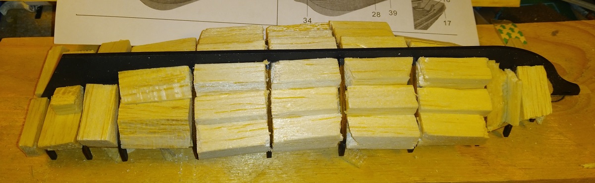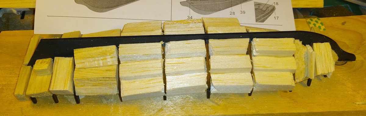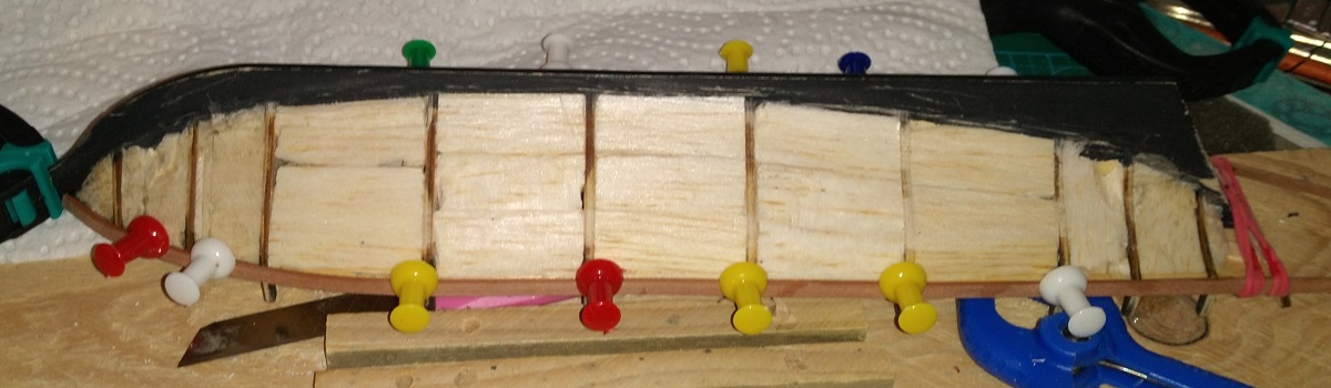 Несмотря на футбол, начал постепенно заполнять шпации бальзой. Заполню все и буду на нее класть чистовую сразу, думаю все грушей 1х3. А то в шпангоуты кнопку не воткнуть, слишком тонкие.
