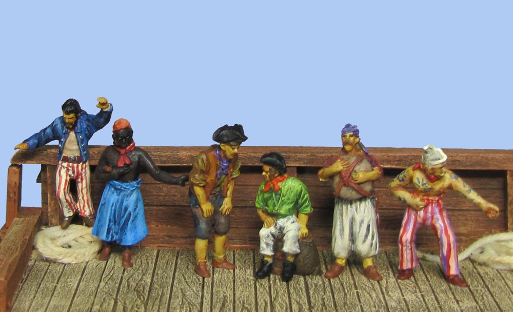 Часть использовать не получится, часть вполне. К тому же это приватир, и форма на матросах далеко не обязательна, там в основном рабочая одежда, и даже на офицерах старый сюртук будет вполне. Экипаж почти всегда состоял из моряков торгового флота, рыбаков и бывших военных моряков, которые отправились за длинным рублем долларом. Единственное, что заменю у части головные уборы на популярные у американцев круглые шляпы, делать их элементарно - кружок бумаги пробойником, и кусочек зубочистки.