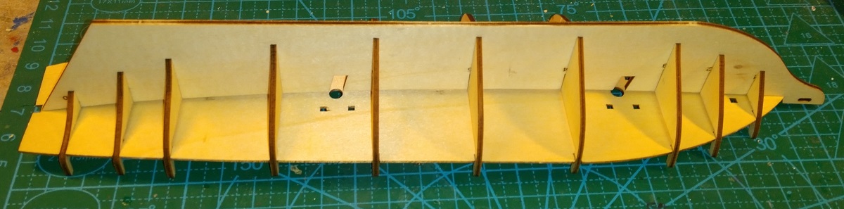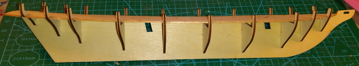 Собрал начерно без клея "скелет". Сошлось идеально, кроме минимального усилия на погибь палубы никакой силы не надо. Шпангоуты сидят неплохо, задние очень плотно, передние посвободнее, но не болтаются. Палуба их держит.