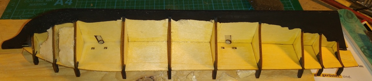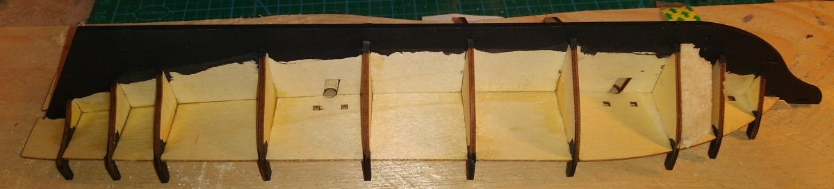 Думаю, как планширь оформить изнутри. Лицевая сторона то осталась чистой, а вот сзади пара подтеков клея. Плюс, к шпангоутам надо было клеить, а я их выламывать буду и вклеивать рейки как эмуляцию верхних ветвей. Так что вопрос - как лучше оформить?
