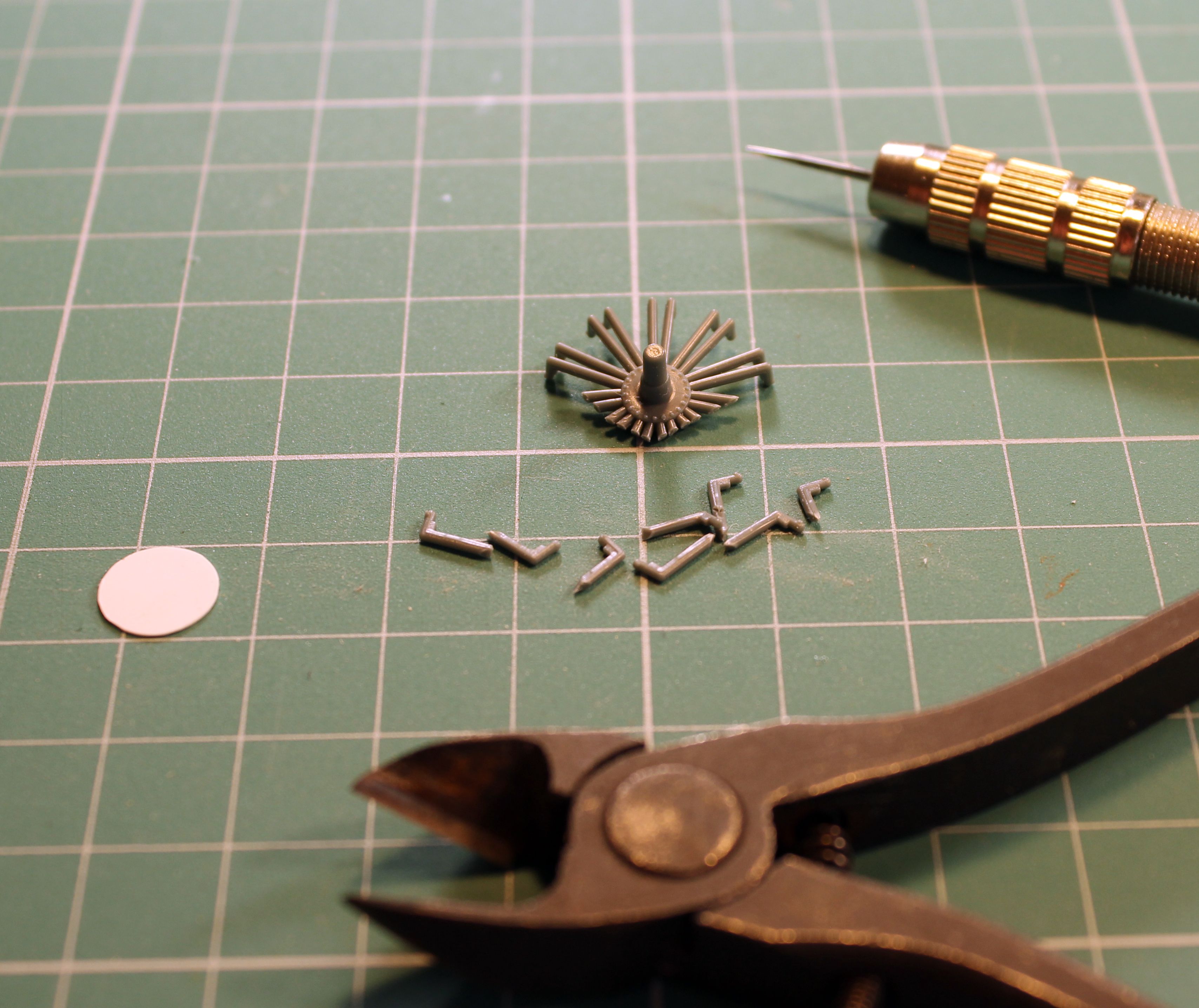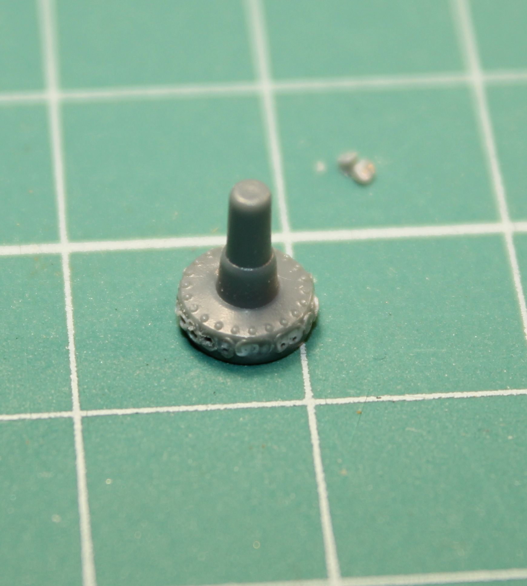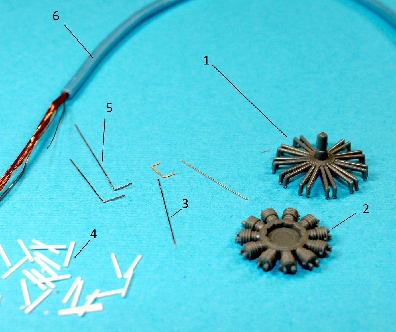 на детали № 1 планируется срезать пластиковые толкатели и просверлить отверстия под проволоку № 3. На делали № 2 сверху обточить деталь до плоскости. приклеить по две детали №4 с заранее просверленными отверстиями. в результате на каждом цилиндре получится по две детали №2. Либо как альтернатива этому геморою - не клеить деталь №2, а расплющить в пассатижах кончик проволоки, согнуть ее под угом 90 градусов и получить деталь № 5 и клеить ее по 2 штуки на цилиндр.