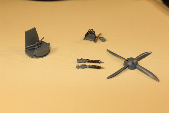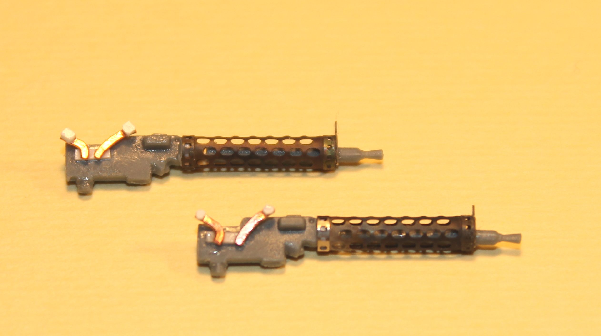 Продолжается сборка узлов. Сегодня добрался до пулеметов, с кожухами справился зато с механизмом накосячил, не хотели детали клеиться и постоянно отваливались от чего я очень хотел ругаться. в результате выбросил все травло механизмов перезаряжания в помойку и из проволоки и пластика сделал свой вариант. Получилось совсем не так ажурно, особенно на фото, но после покраски думаю будет смотреться нормально.
