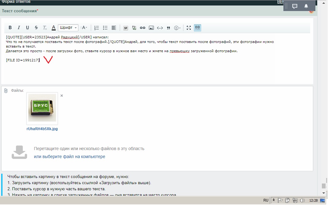 В результате получите вот такую запись в квадратных скобках (это и есть ваше фото в тексте).