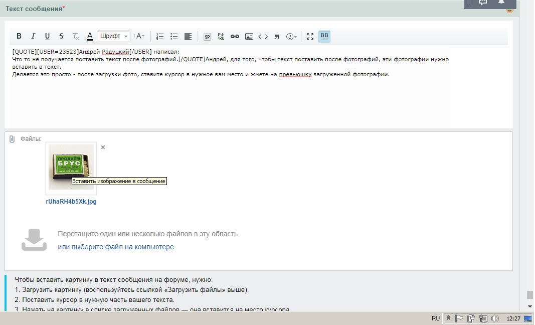 Делается это просто - после загрузки фото, ставите курсор в нужное вам место и жмете на превьюшку загруженной фотографии.