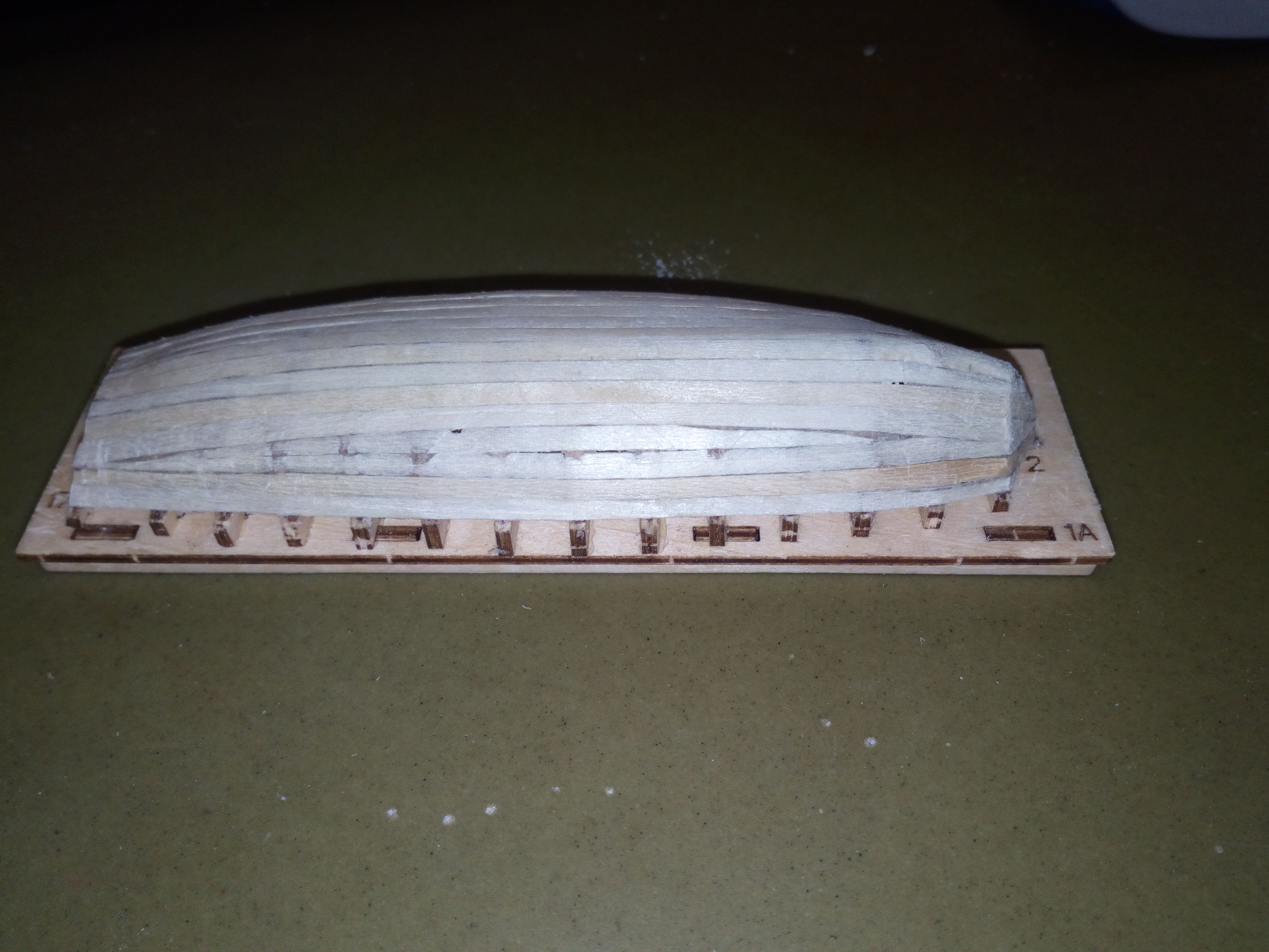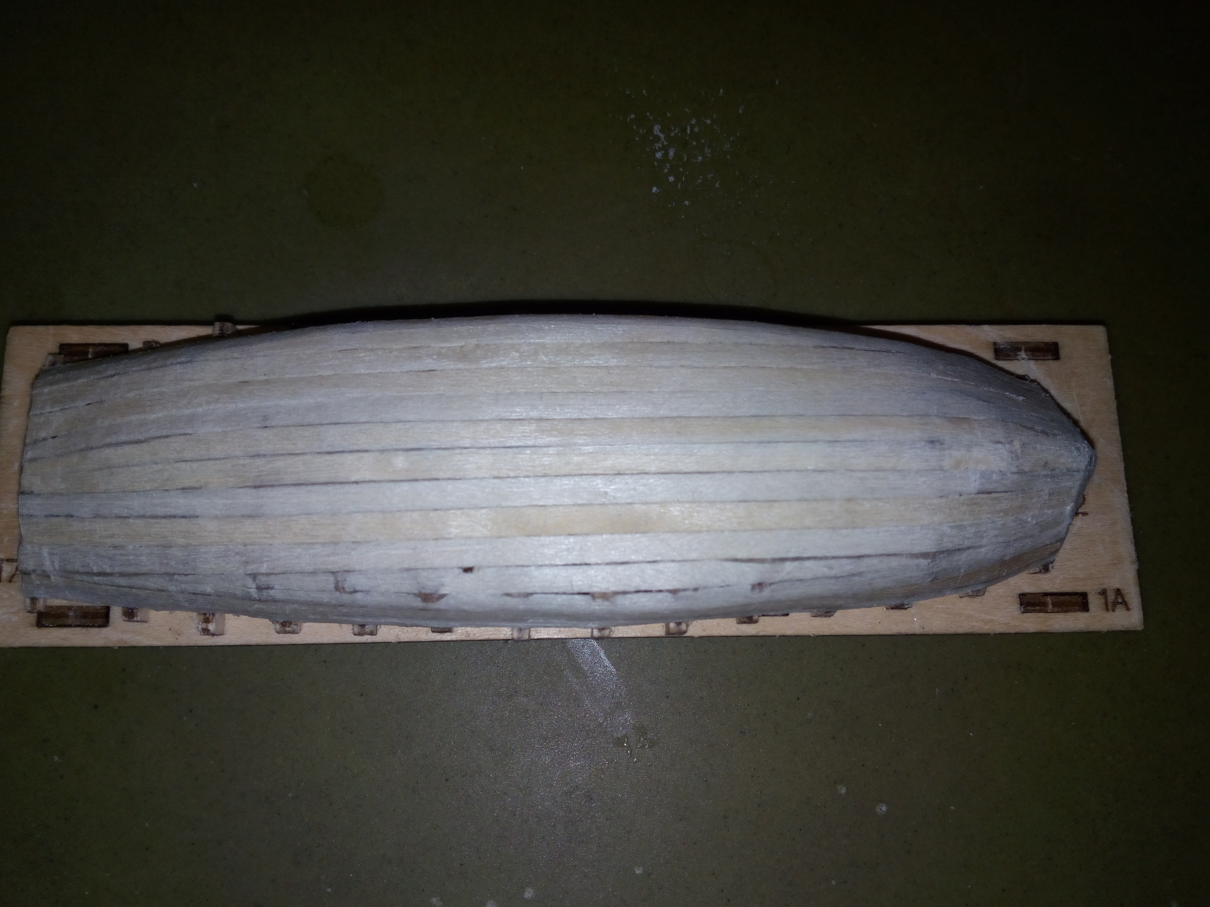 Закончил обшивку шлюпки. Видны косяки с неточной и неровной подрезкой реек. Плюс немного сместил обшивку от центральной линии по диагонали. Материал очень тонкий (0,3 мм), поэтому при шлифовании получились почти что дырки в обшивки (видны шпангоуты). Вопрос такой: закроются ли эти косячки при нанесении лака? И какой лак лучше использовать.