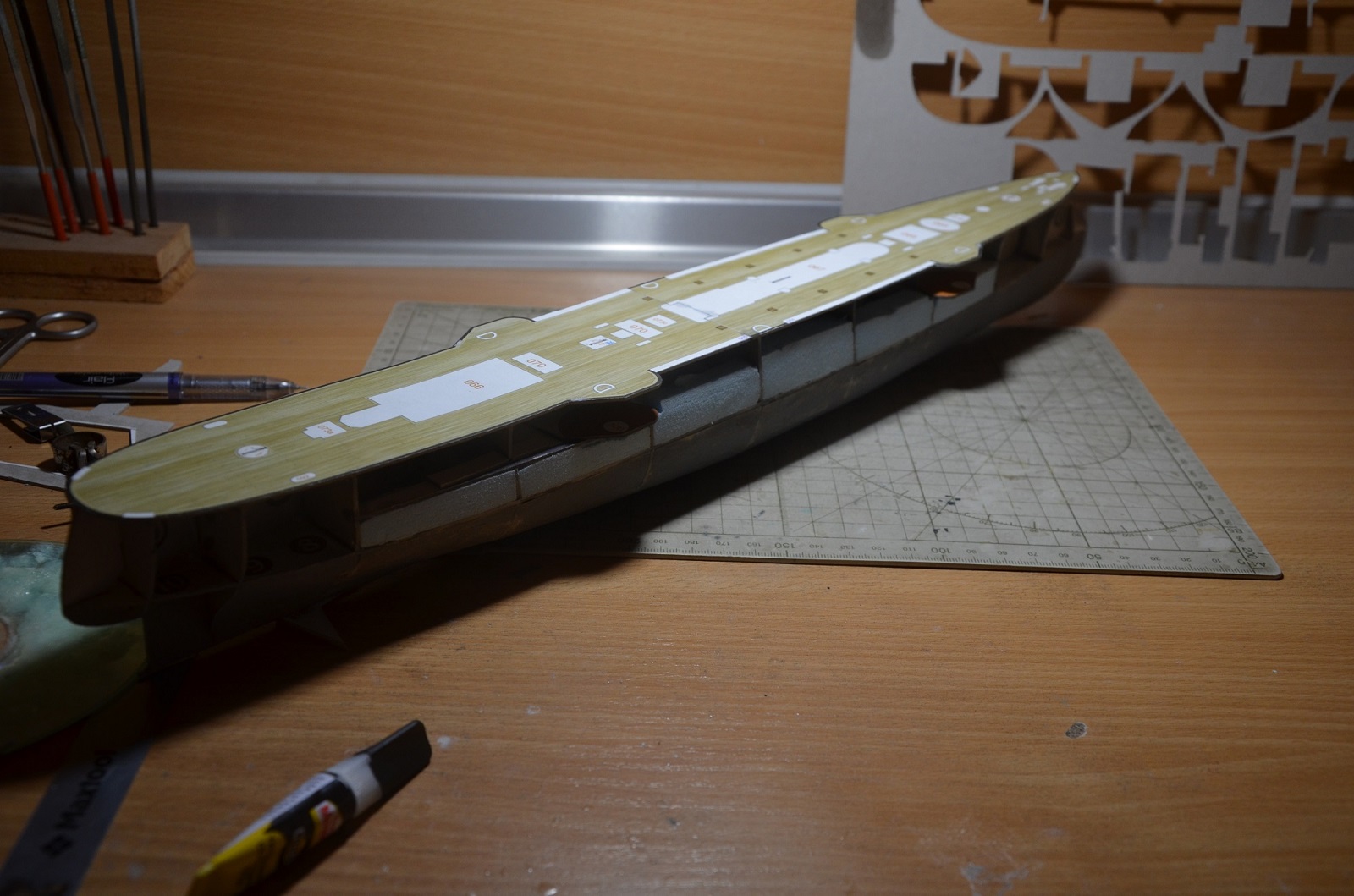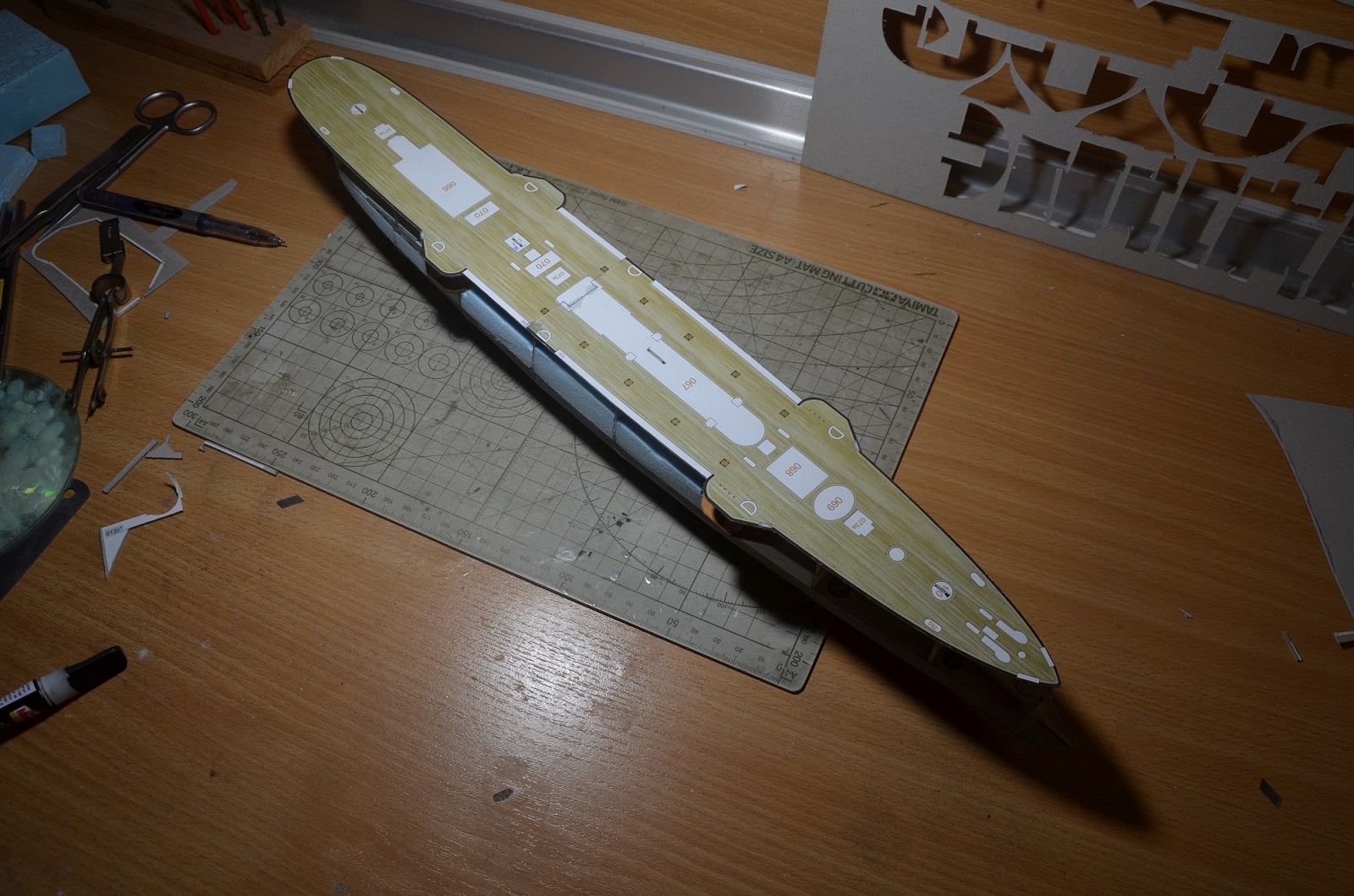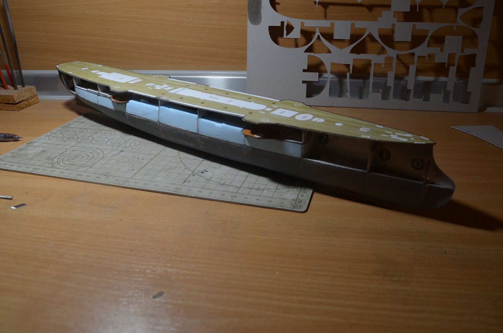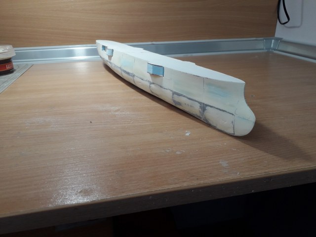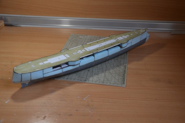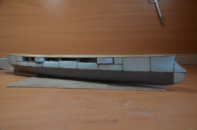 Так что впереди самое веселое. По предварительному опыту выкройки борта сходятся не на отлично, но работа под полный окрас и это не страшно. Расхождение не большое, так как корпус ошкуриваем и произвольно снимаем порой лишнего... Палуба является индикатором и она как правило ложится на хорошо, лучше чем выкройки борта.