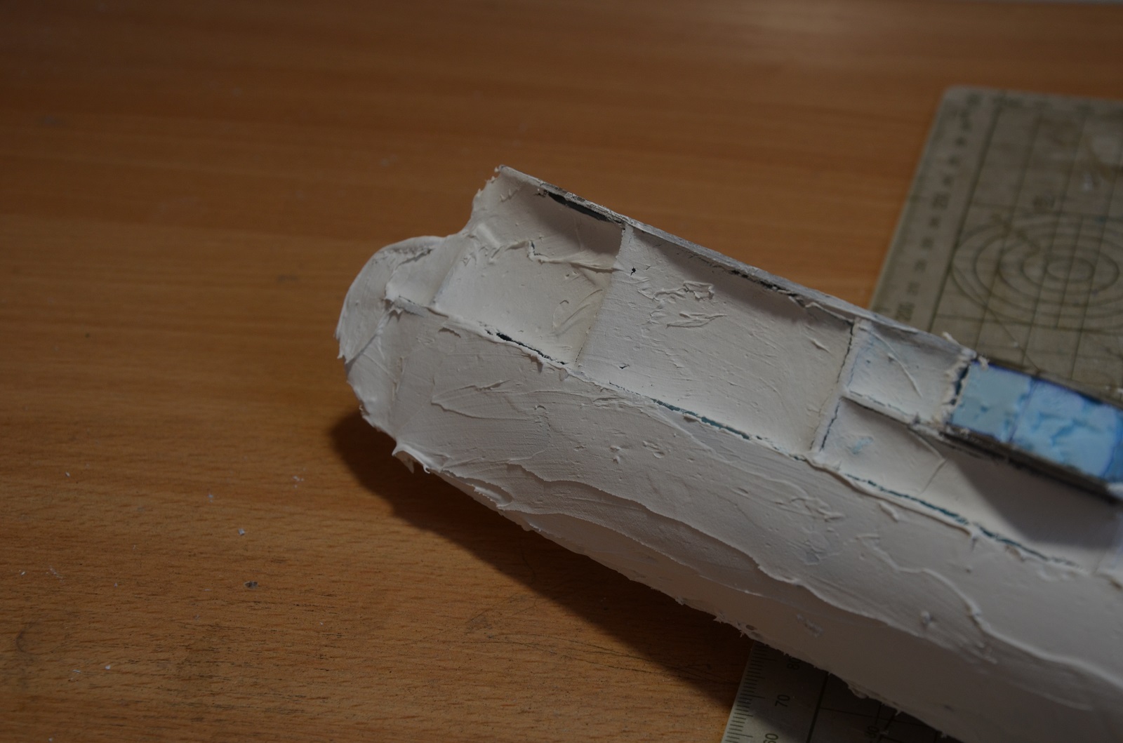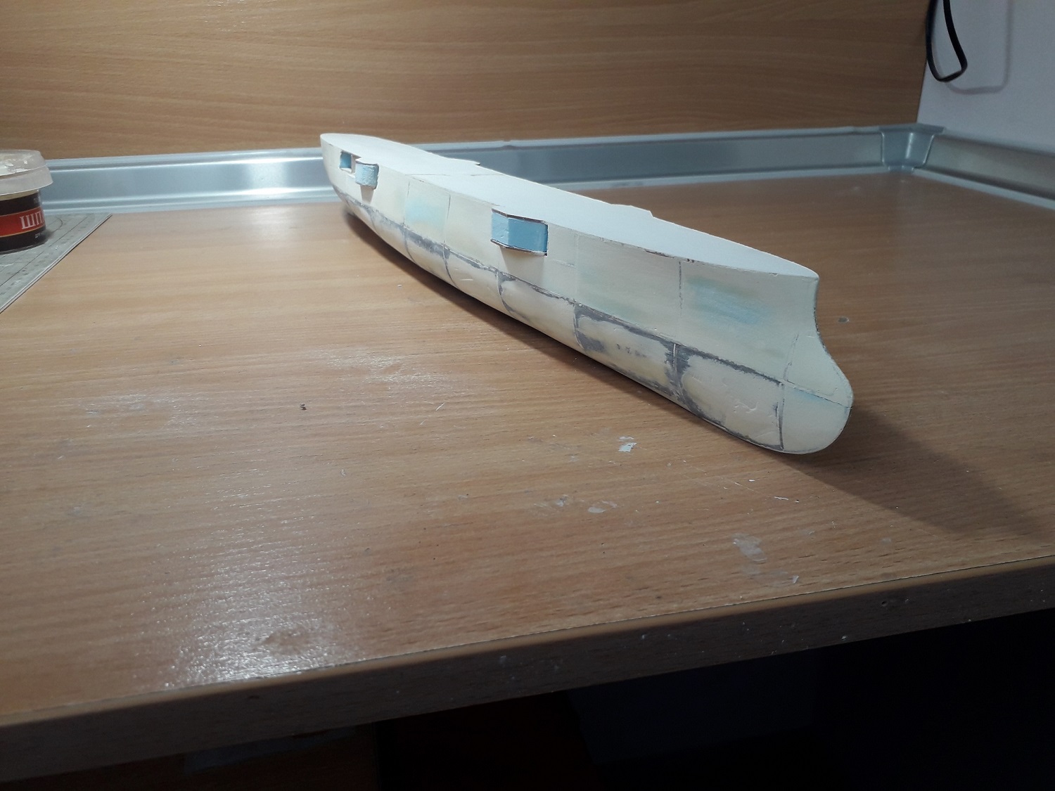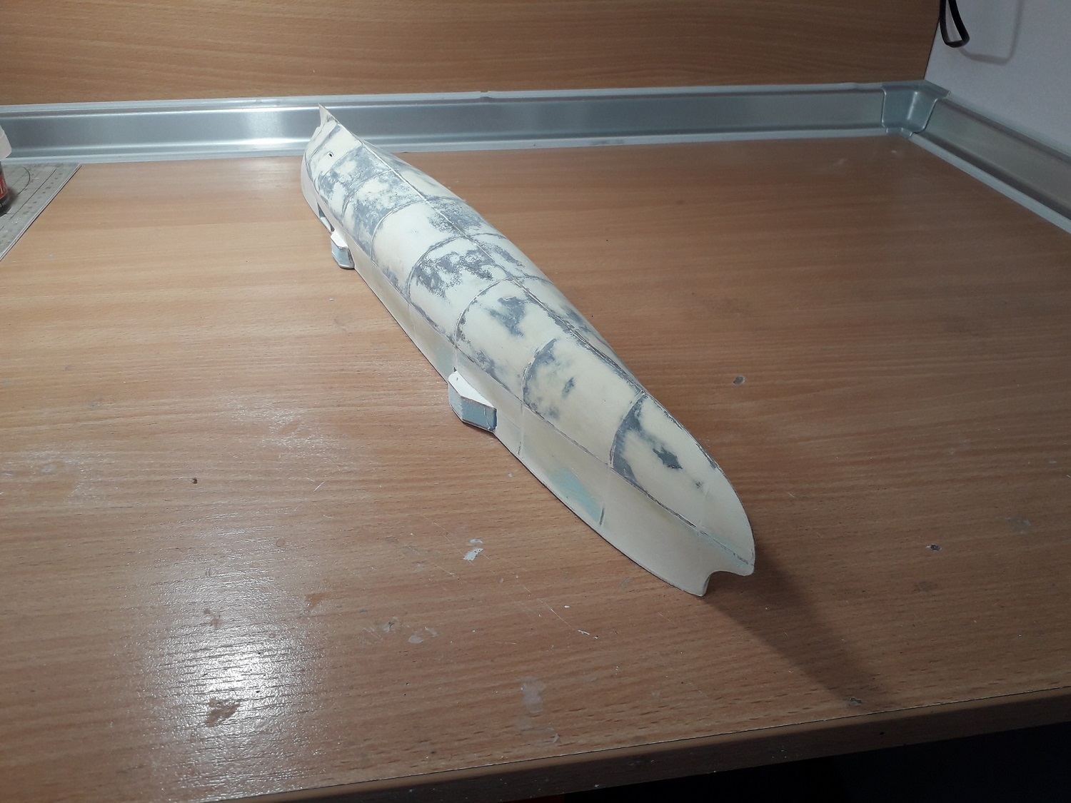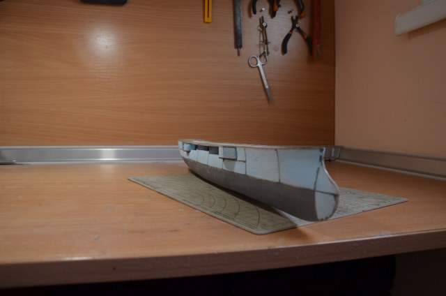 Очень интересно. Жаль корпус который выкинули. Честно, говоря, я б наверное достроил, если б уже на таком этапе всплыл винт. Подскажите пожалуйста, пенопласт надо зашкуривать пока не проступят все элементы набора (если потом просто под обклейку выкройками корпуса, без шпатлевки), я правильно понял?