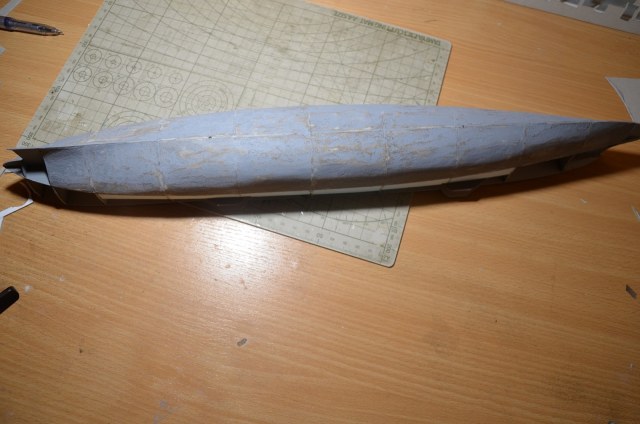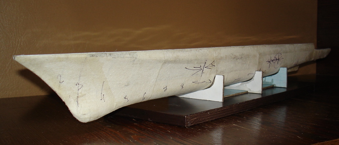 Собрали каркас, заполнили корпус, потом вывели обводы и ! обклеить из журнала, желательно аккуратно и подгоняя стыки, сегментами днища и бортов.