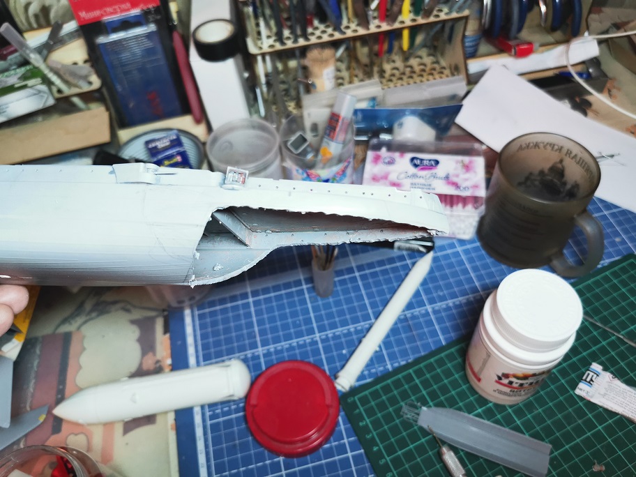 Теперь это надо состыковать с задней частью корабля. Все поверхности криволинейные, подгонять придется долго