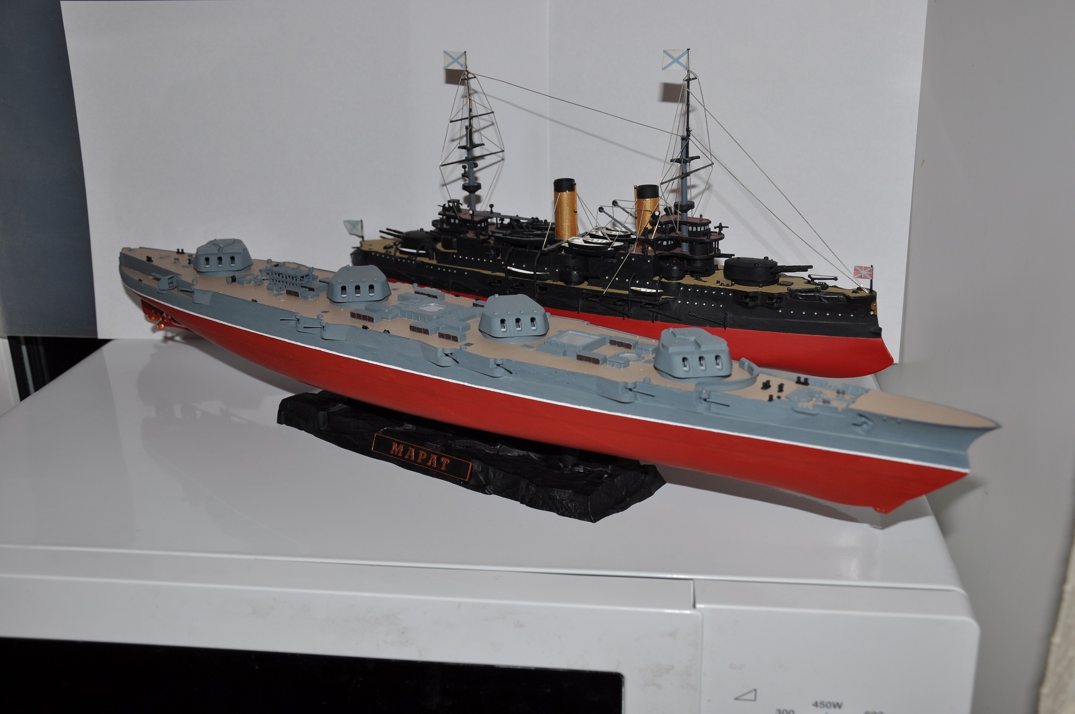 Оказалось у меня в руках два набора линкора "Марат". Получилось это вот почему. Года три назад была куплена модель "Марата" от Звезды и начата собираться изкаробки. С окраской кисточкой. Собрал корпус, покрасил палубы, начал ставить башни. Полез в Интернет что-то смотреть по кораблю - и наткнулся на профессионально сделанные модели кораблей. Уже не помню был это именно Марат или нет, но совершенно точно это был линкор времен Второй мировой.