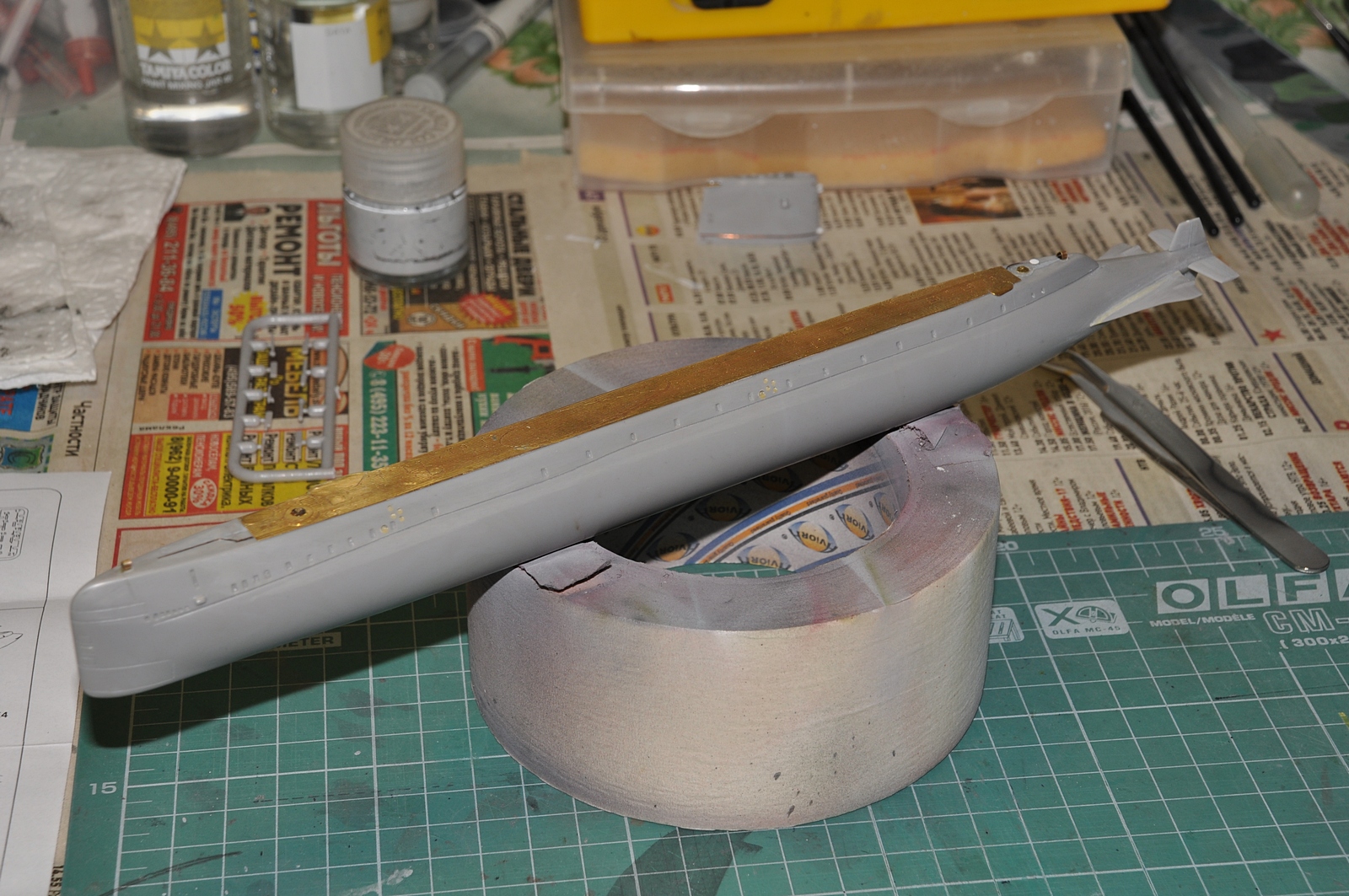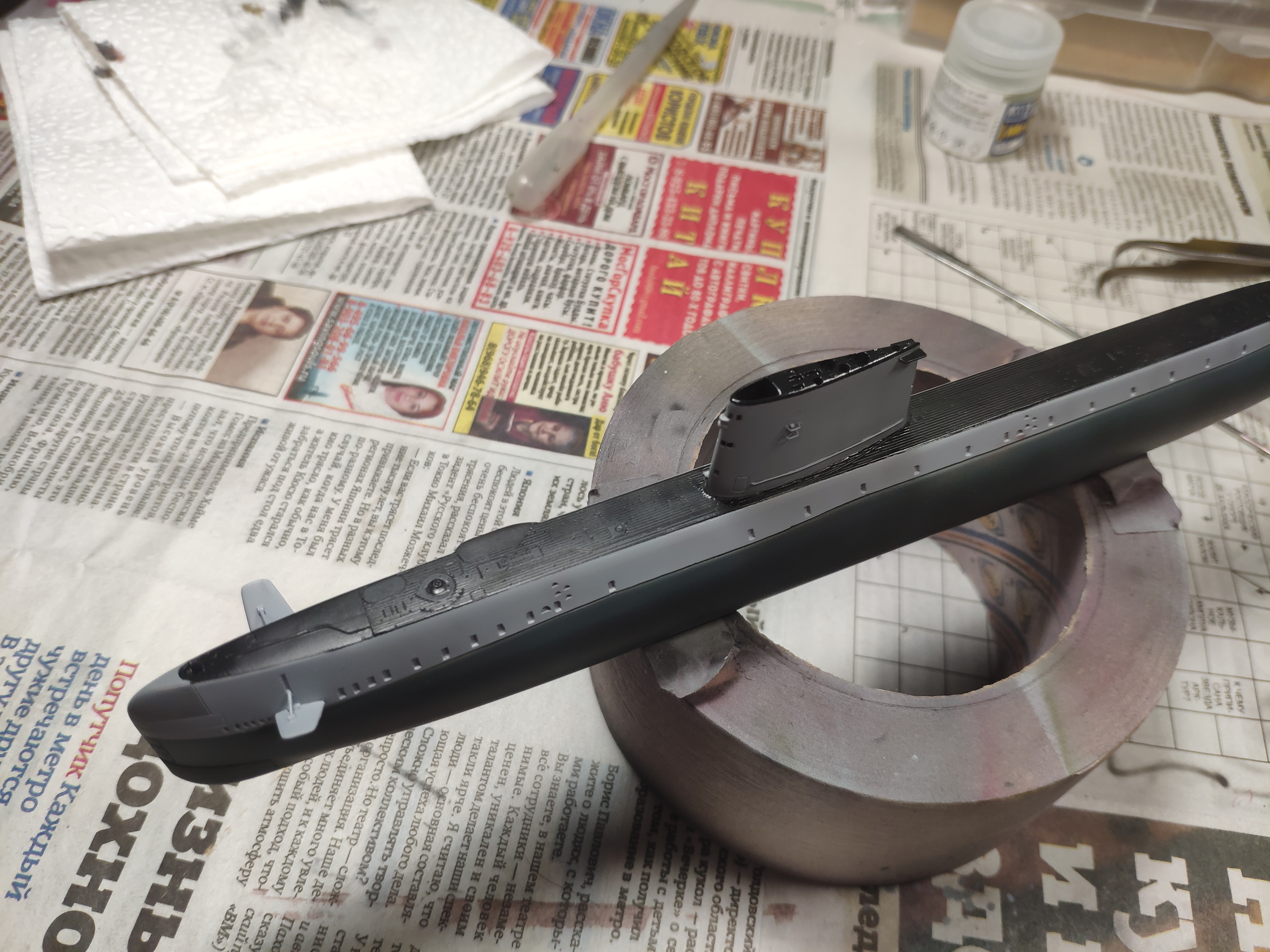 Склеил половины корпуса - далее устранение щелей, выведение кормовых обводов и приклейка палубы. Затем имитация бортовых "трапов" по методу Сергея и доработка пластиковых участков палуб в носу и в корме лодки.