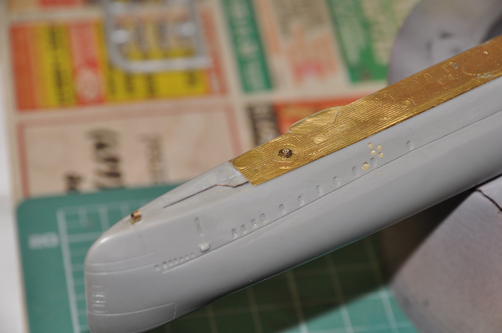 Продолжаем. Смонтировал травленую палубу, доработал носовую и кормовую оконечности палубы лодки, которые не закрывает травленая деталь.