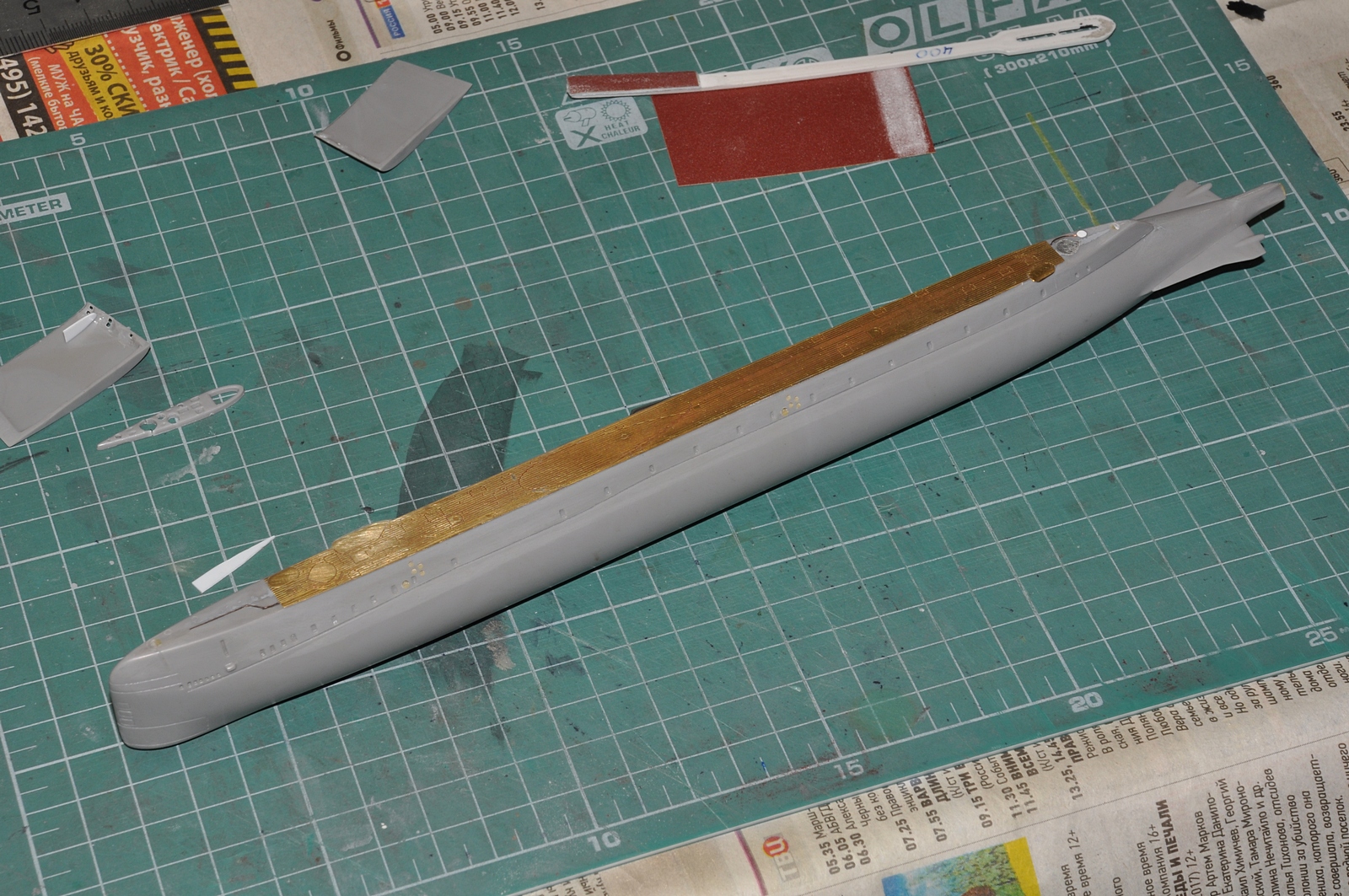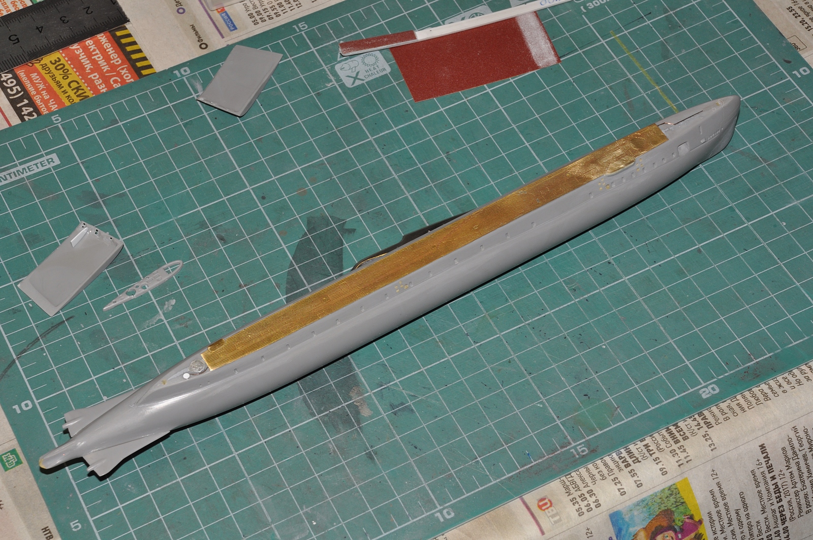 Коллеги, всем спасибо за пожелания! Корпус собран, отшлифован, выведены стыки, восстановлена расшивка панелей ГАК, высверлено отверстие якорного клюза, сделал забортные трапы в надстройке. Есть готовность к монтажу палубы.