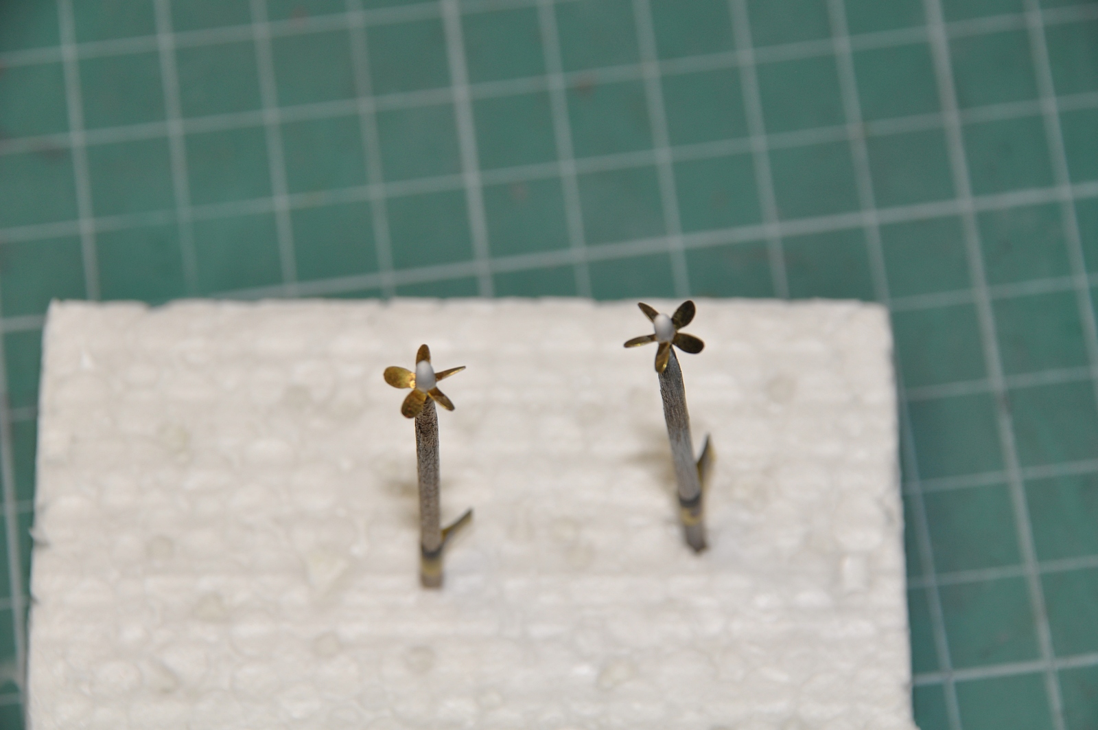 Собрал гребные винты. Ступицы выточил из пластикового прутка 1,6 мм, лопасти отрезал от оснований и по отдельности приклеил к ступицам