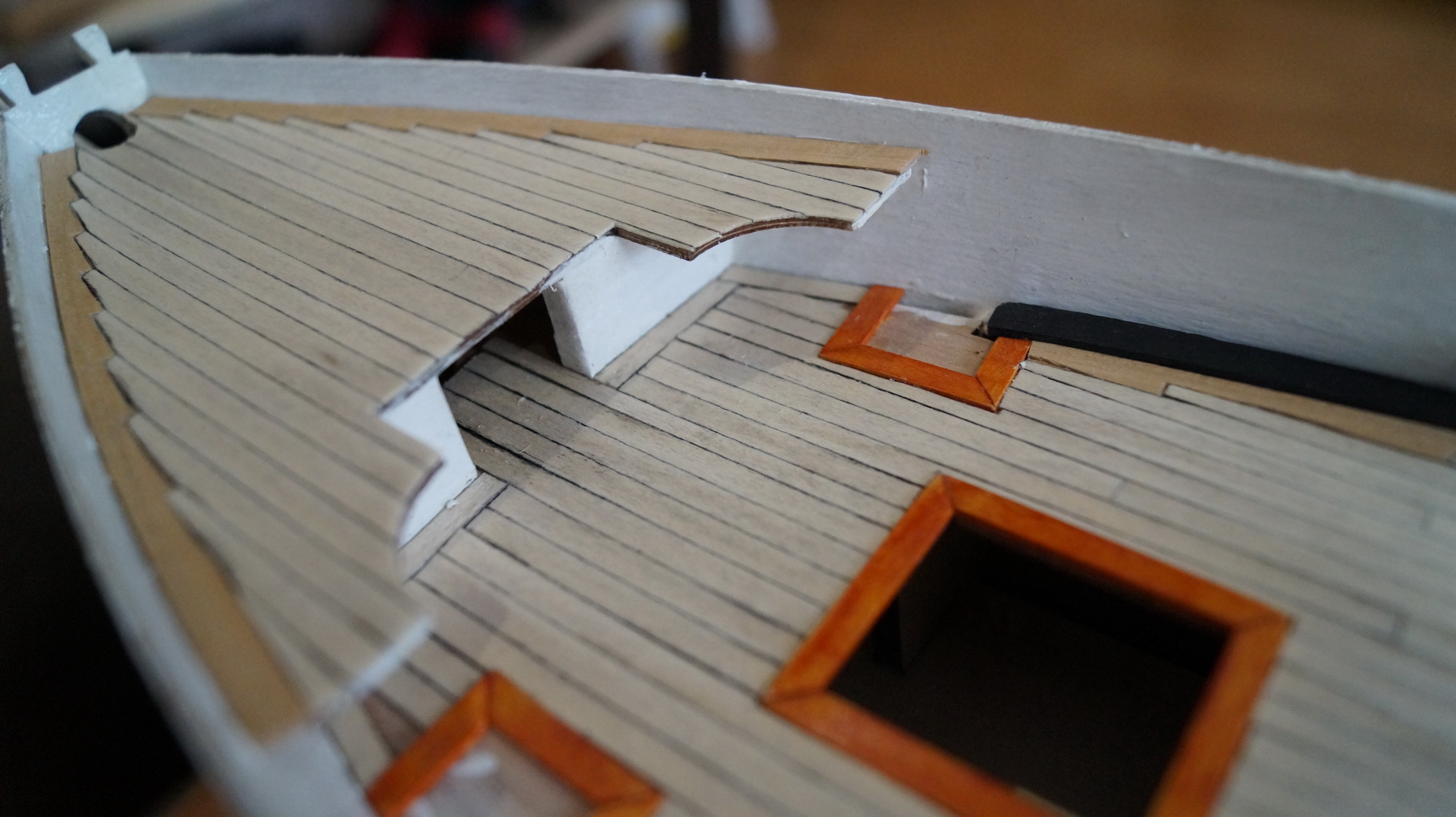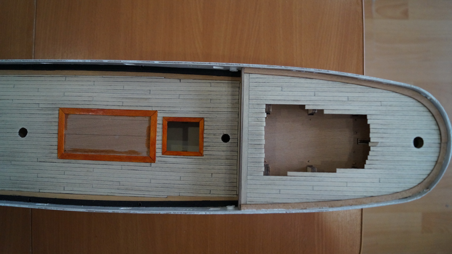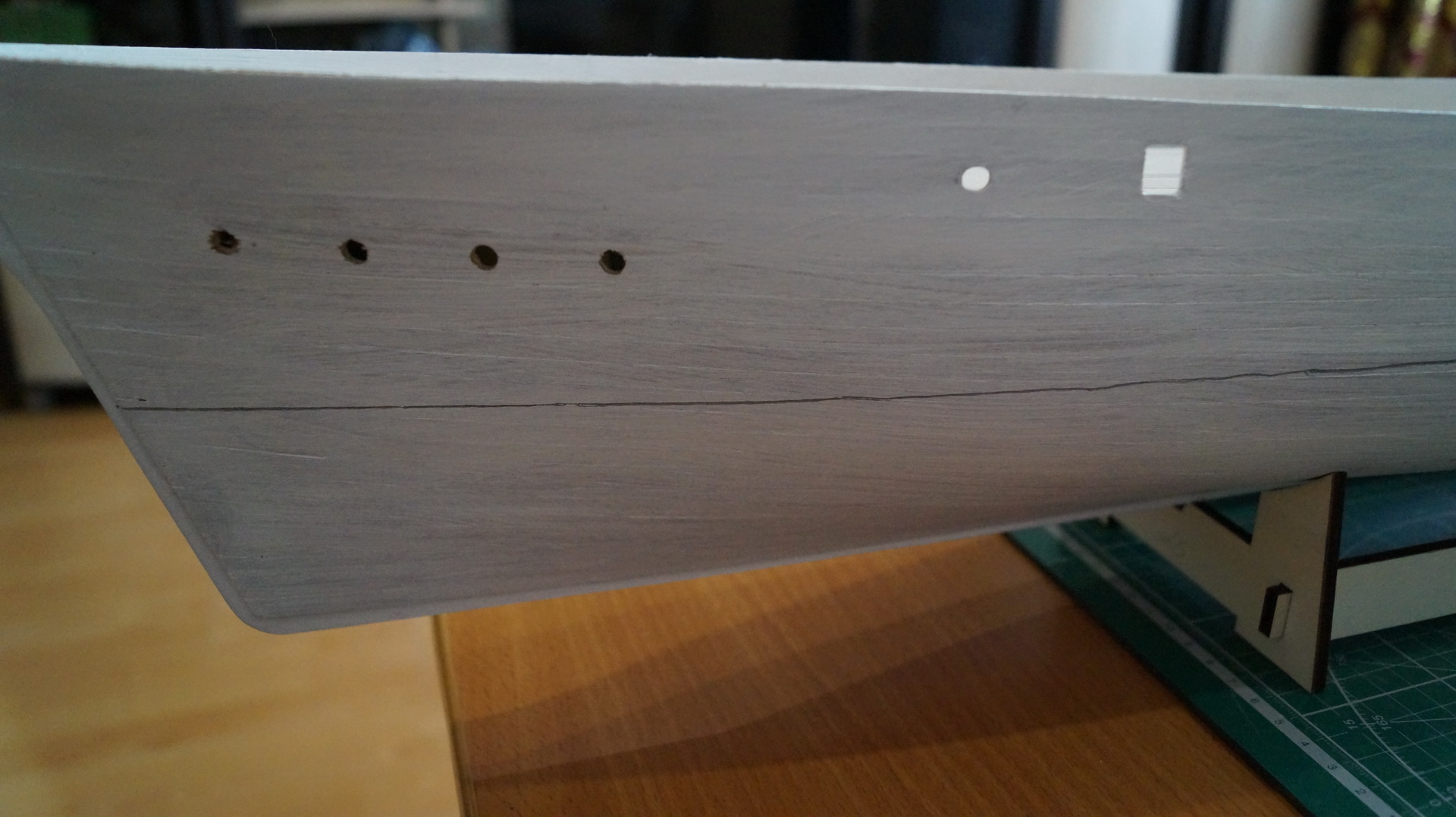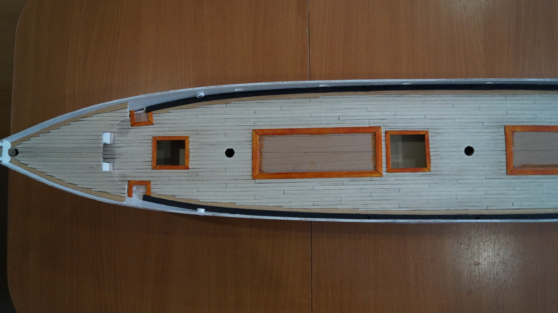 Продолжаю работу над моделью: корпус зашпаклеван, зашкурен и загрунтован. На мой взгляд, корпус получился вроде без косяков. В фальшборте прорезал штормовые шпигаты, отверстия под швартовные клюзы, иллюминаторы и шкивы. Решил до покраскии финишной отделки корпуса сделать палубу. И вот тут возникло несколько вопросов: