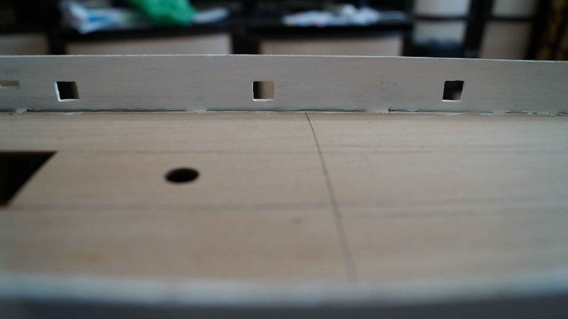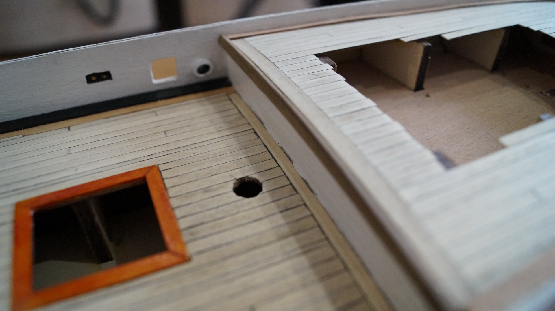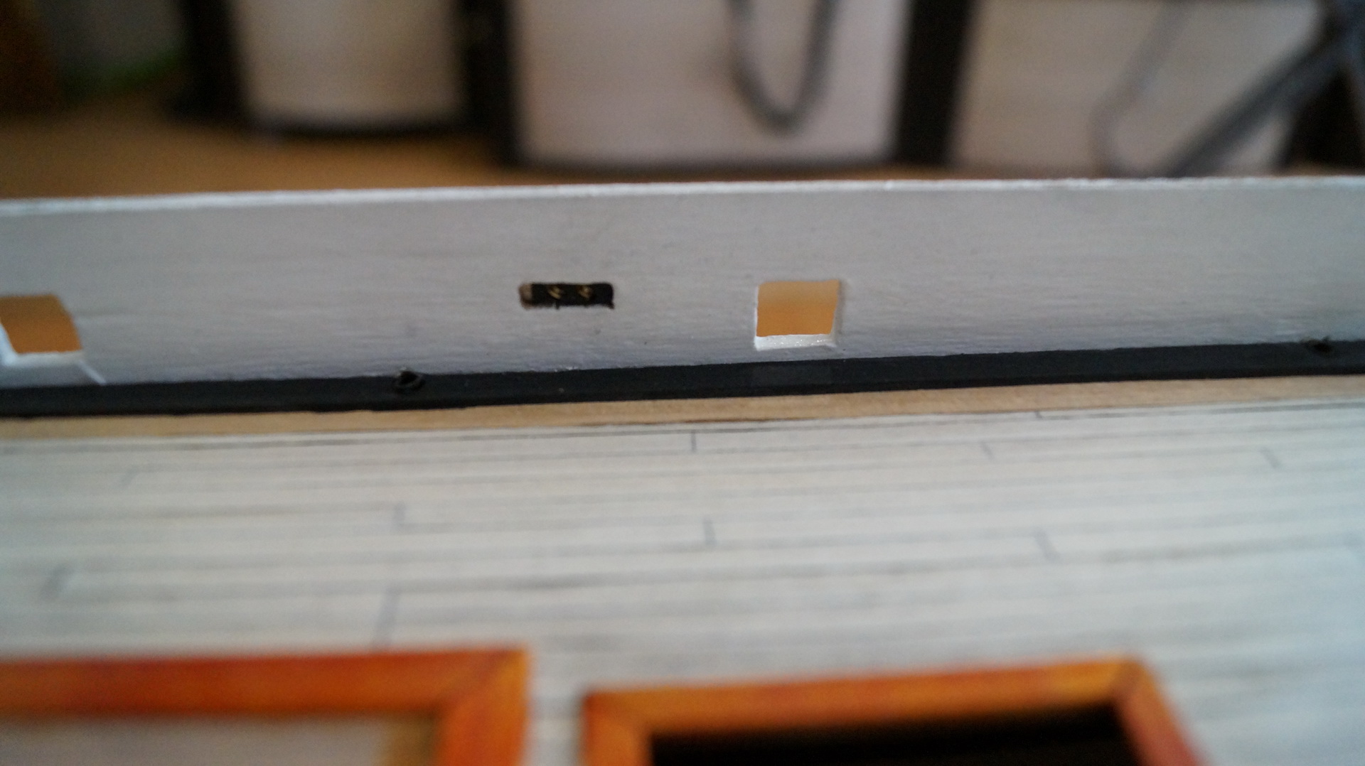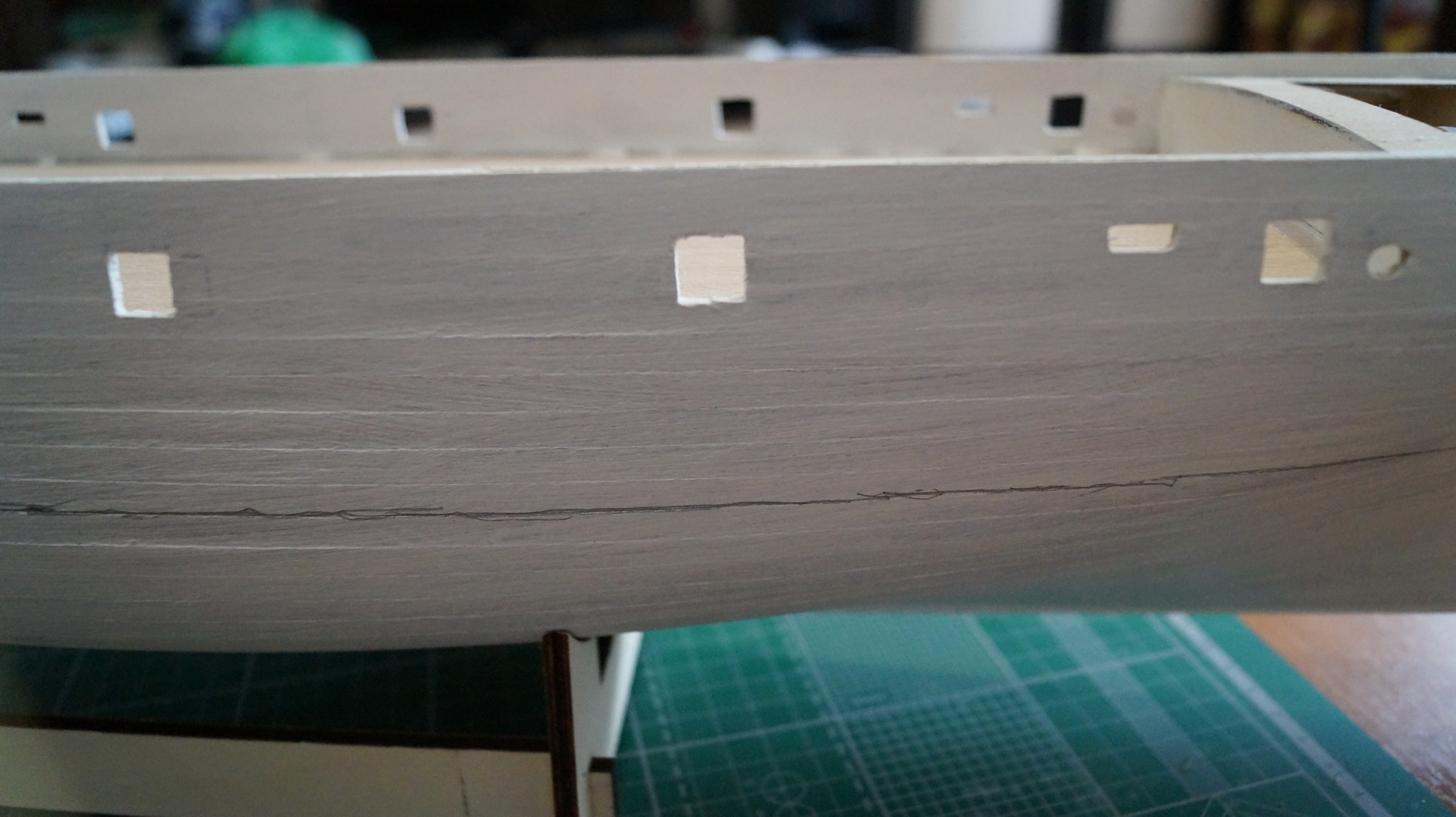 Продолжаю работу над моделью: корпус зашпаклеван, зашкурен и загрунтован. На мой взгляд, корпус получился вроде без косяков. В фальшборте прорезал штормовые шпигаты, отверстия под швартовные клюзы, иллюминаторы и шкивы. Решил до покраскии финишной отделки корпуса сделать палубу. И вот тут возникло несколько вопросов: