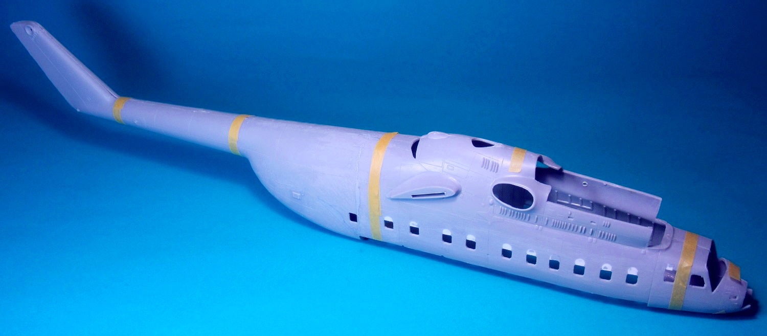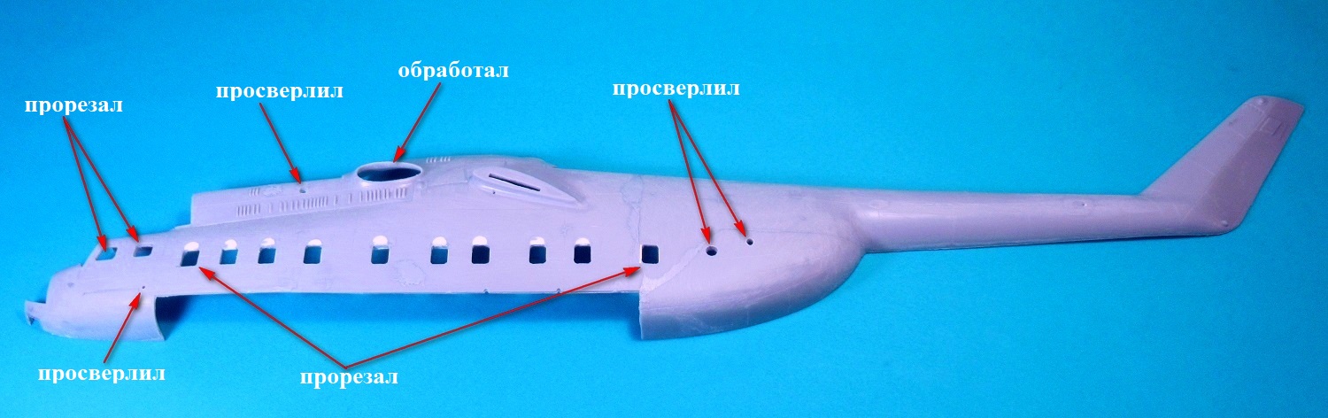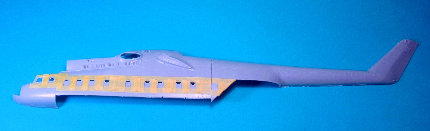 Склеил обе половинки фюзеляжа, прорезал иллюминаторы. Пока не подгонял половинки, просто соединил на скотче.