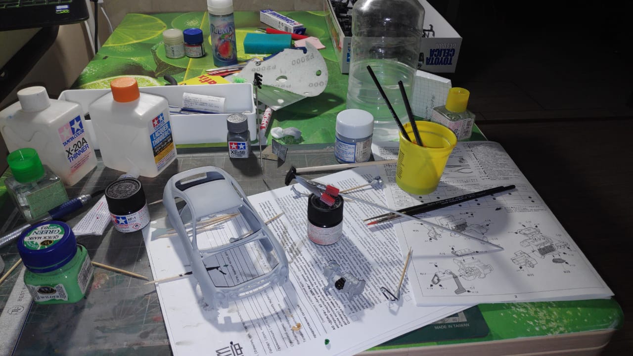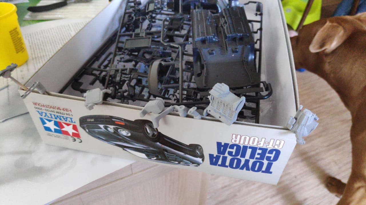 Всем доброго дня. Время идет, тушка взрослеет, но детские мечты остаются мечтами. Поэтому в приступе очередного плохого настроения решил исполнить мечту и купить ту машину, которую хотел в детстве Toyota Celica. Правда в масштабе 1:24, тем интереснее. Нет ограничения в выборе цвета и тюнинга. Модель буду строить из коробки. Коробочный вариант позволяет делать машину с левым или правым рулем. Но судя по отливке сидений проектировалась она по леворукому образу ибо в японии машинка укомплектовывалась ковшиками Рекаро, а на европу шли дутые кожаные сиденья. Кроме того хочу попробовать в этой модели полный цикл окраски как на больших машинках, т.е. грунт, 2 слоя краски, 3 слоя лака, полировка лака с водичкой и доводка полировальной пастой. Куплено всё было 17 числа. На данный момент подобран цвет машинки, загрунтовал тушку кузова, есть небольшие огрехи, поправлю вечером. Загрунтован и покрашен в базовый цвет двигатель, попробую закончить с росписью сегодня вечерком. Задача супер один загрунтовать всю крупночь, закончить с двигателем и начать хотя бы насухую прикидывать, что и как