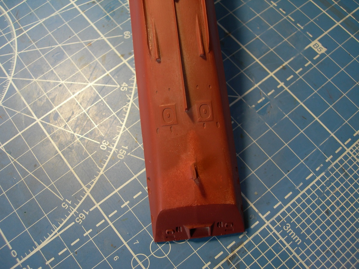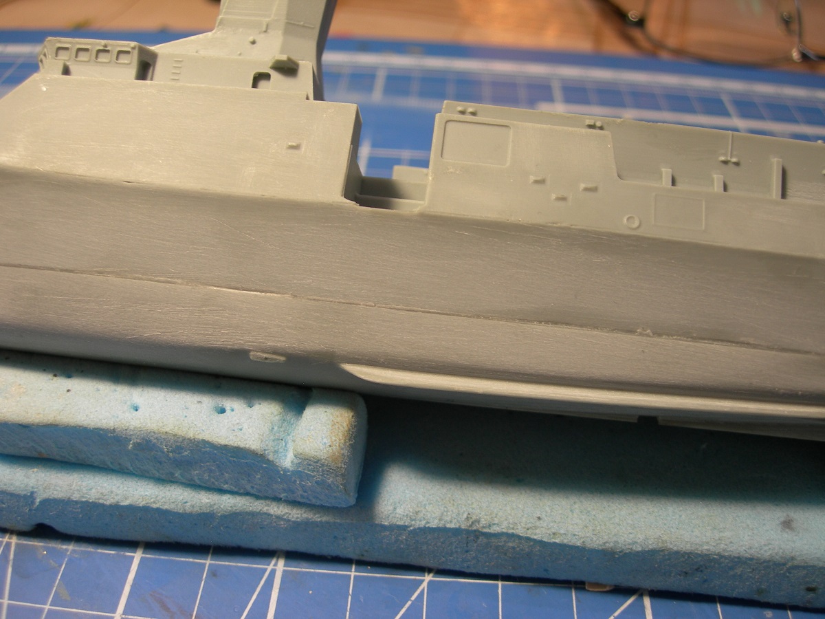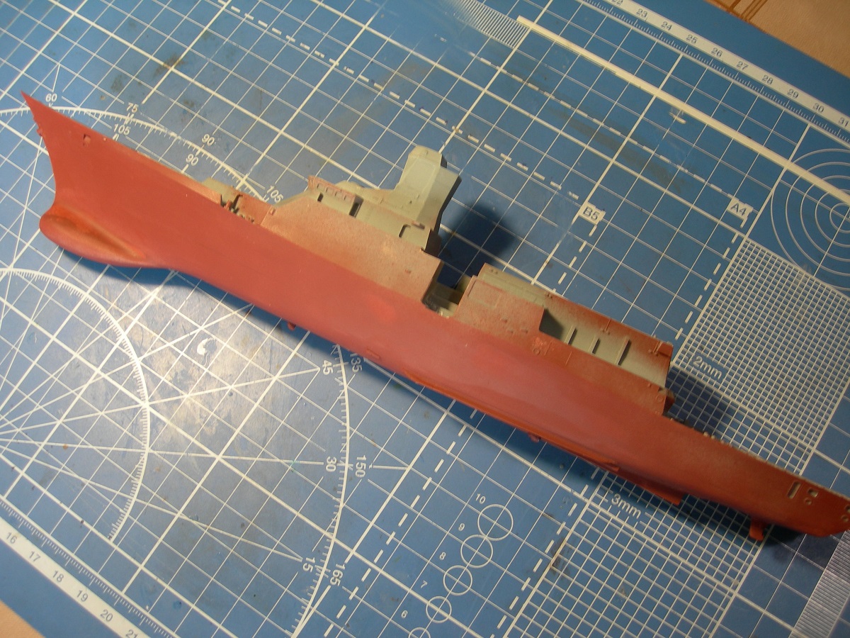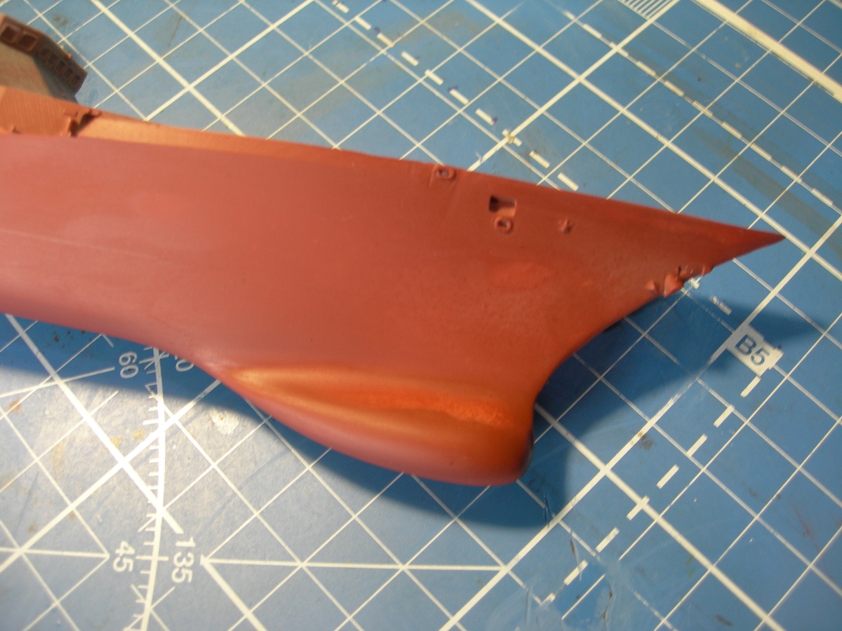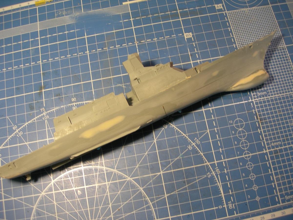 Зашпаклевал корпус. Для начала на кормовом подзоре с помощью эпоксилина наформовал недостающую часть. По основным косякам корпуса прошелся эпоксидной шпаклей (клей ЭДП+ аэросил в качестве наполнителя). Недостаток- слишком твердая, шкурить то еще удовольствие. Но хороша для восстановления мелких элементов. Затем автомобильная NOVOL, в отличии от полистирола, на смоле держится отлично. Ну и зачищать легко. В завершении кое-где прошелся тамиевской белой. В завершении запылил грунтовкой из баллона. Хотя правильнее это назвать не грунтом, а проявочным слоем. Косяков выявлено предостаточно. Впрочем другого и не ждал.