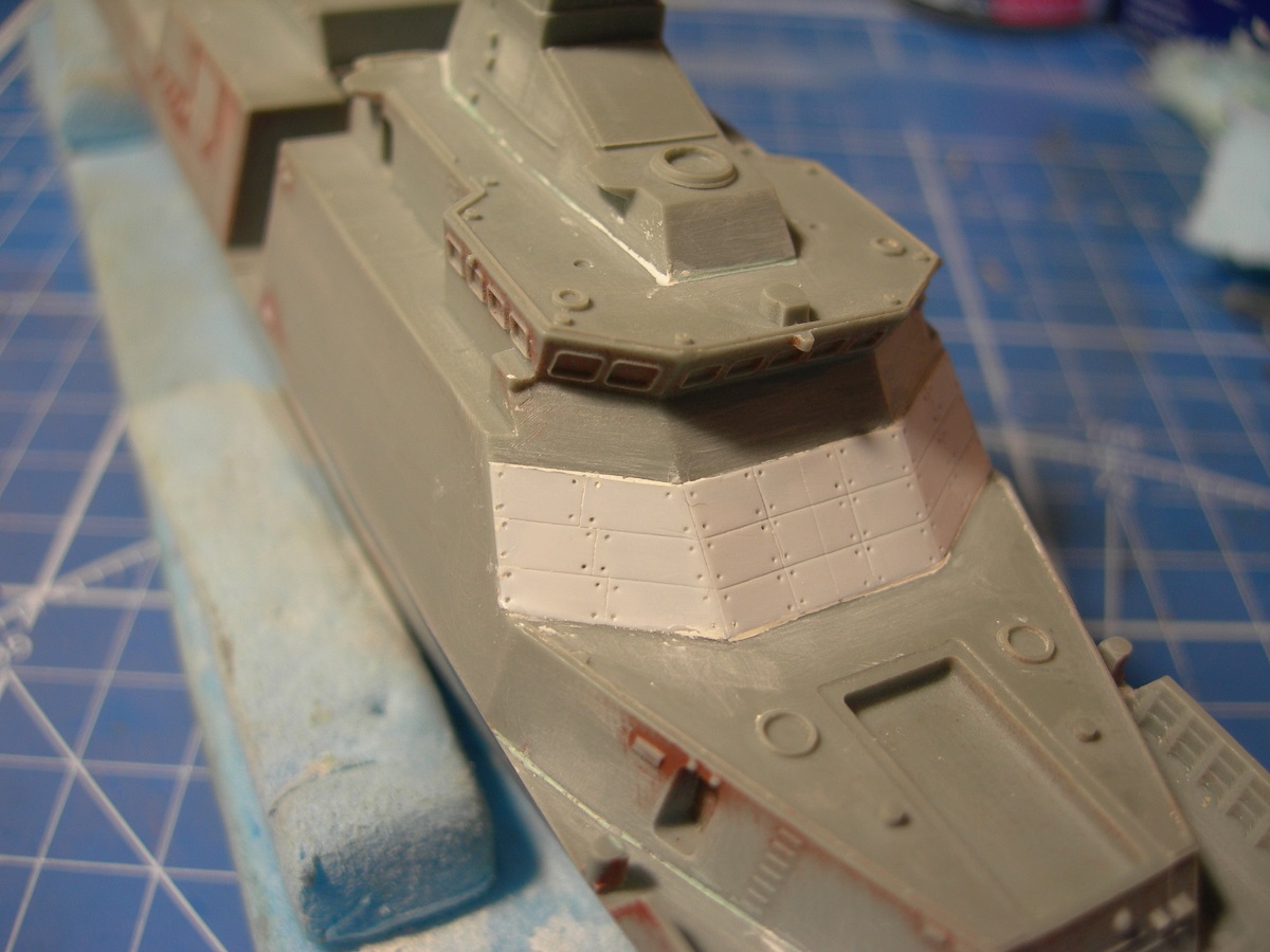 Решил заняться травлом. И тут подстерегала проблема. На лобовую часть надстройки предполагается установка жаропрочных панелей. Травло из нержавейки. Возможно по аналогии с прототипом. Проблема в том, что там же устанавливается скоб-трап. Именно скоб, а не наклонный, как в наборе. Пытаться сверлить нержавейку сверлом 0,2 мм задачка невыполнимая, по крайней мере для меня. Перепробовал несколько вариантов (отливка эпоксидки в силиконовую форму, штамповка в тамиевскую 2-х компонентную шпаклю и пр.). Результат "0". В итоге нанес расшивку на дошипласте. Получилось утрированно, но по крайней мере это даст возможность просверлить или прорезать посадочное место под скоб-трап. Пока упражнялся возник вопрос: неужели вся эта хрень на лобовой части только для того, чтоб иметь возможность добраться снаружи до иллюминаторов?