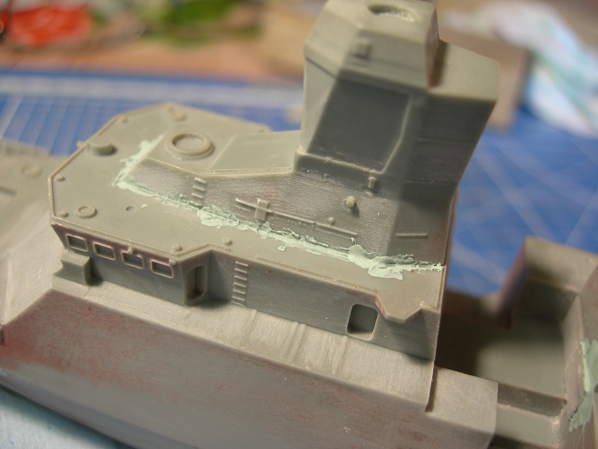 Подшпаклевал стыки надстройки и палубы. "Оформил" якорный и буксирный клюза.