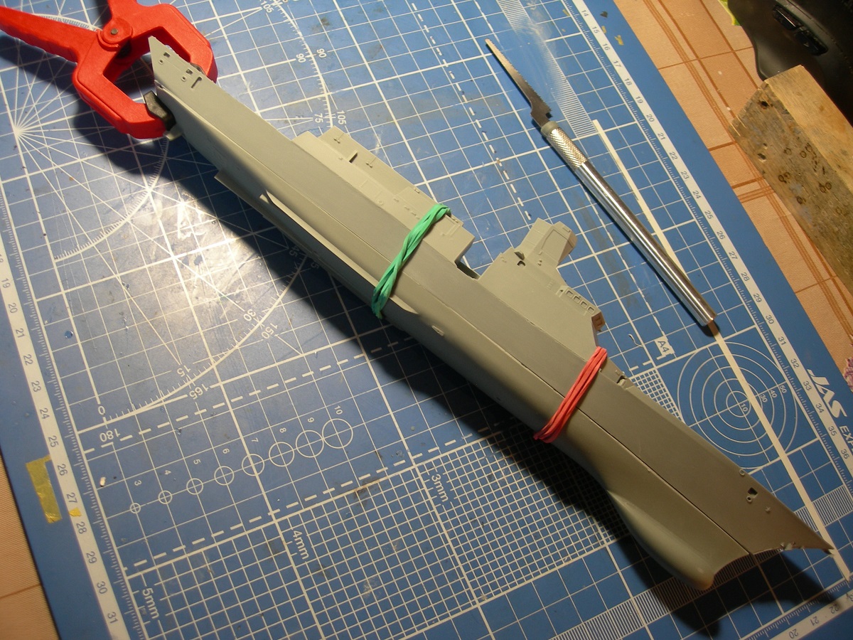 Небольшое обновление. Сделал окончательную примерку перед склейкой половин корпуса и обнаружил,что нижняя часть слегка изогнута. Тот же косяк, о котором писал Игорь Ушаков в своей сказке. Располовинить не решился, просто сделал надрез и вставил зубочистку. Корпус склеил старым добрым эпоксидным ЭДП. Не доверяю я циану, когда склеиваешь под нагрузкой. Первый раз пригодились джасовские пластиковые зажимы. На очереди шпаклевка и выведение обводов.