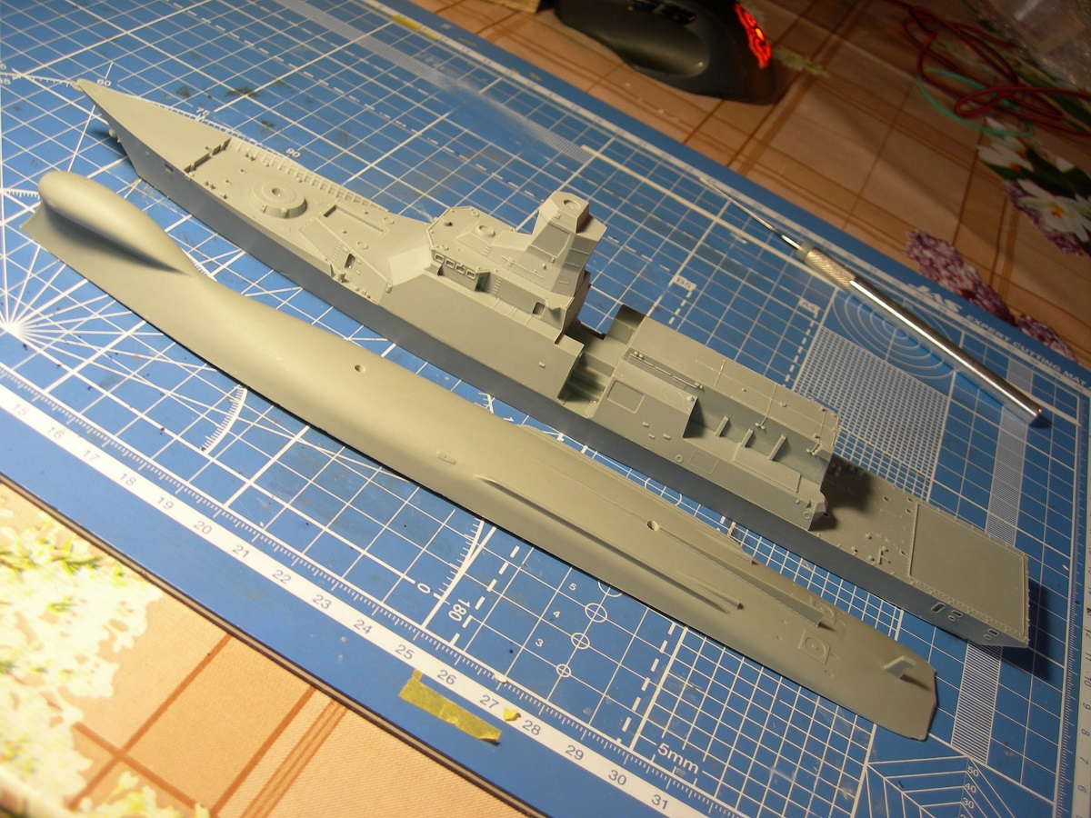 Дмитрий, Иван, вы спецы по надводным, вам почетные места в зрительном зале. Было желание поскорее склеить половинки корпуса, но потом решил с этм не торопиться. Иван, согласен, надо по максимуму сделать подгонку, ну и при детальном рассмотрении выявились шероховатости, которые проще устранить на половинках.