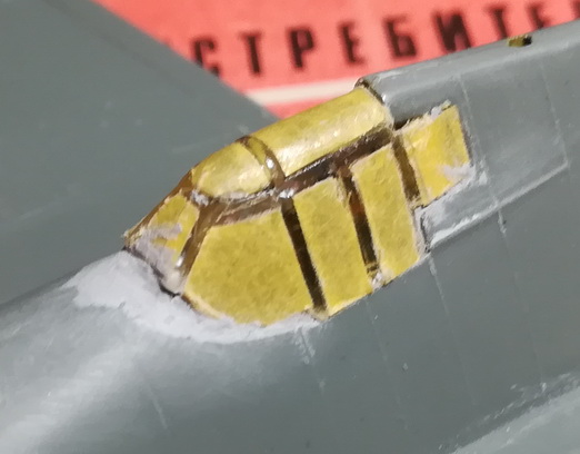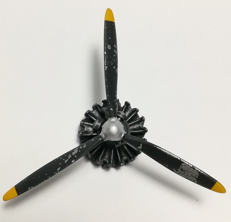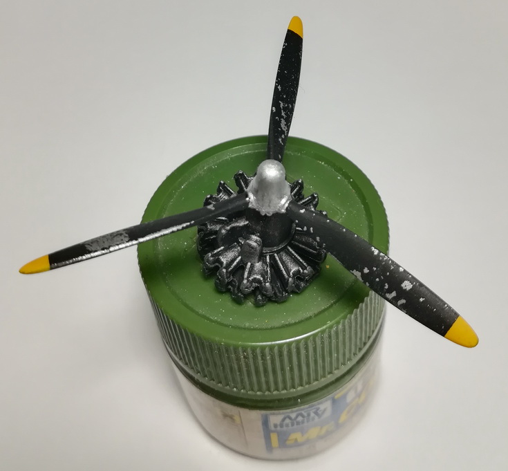 Здравствуйте, друзья! Сегодня прошелся по мелочевке. Вот фото.Мрачноватые какие-то шасси получились, но, думаю, на модели не так будет заметно. Покрасил винт, двигатель. Двигатель предварительно был задут серебрянкой, поэтому его я ободрал, а по мотору прошелся сухой кистью.