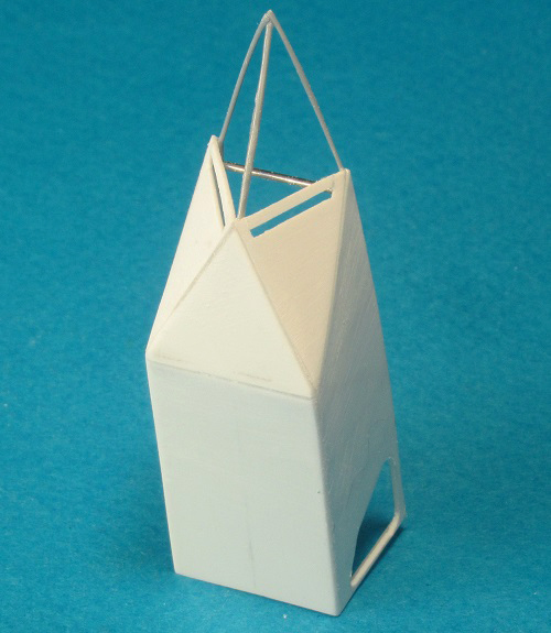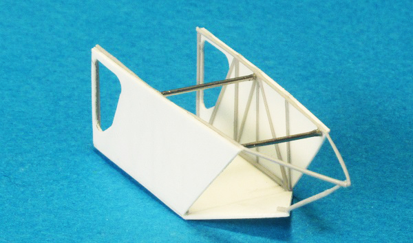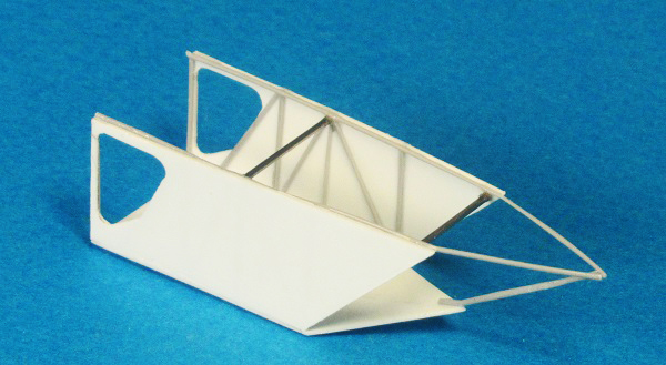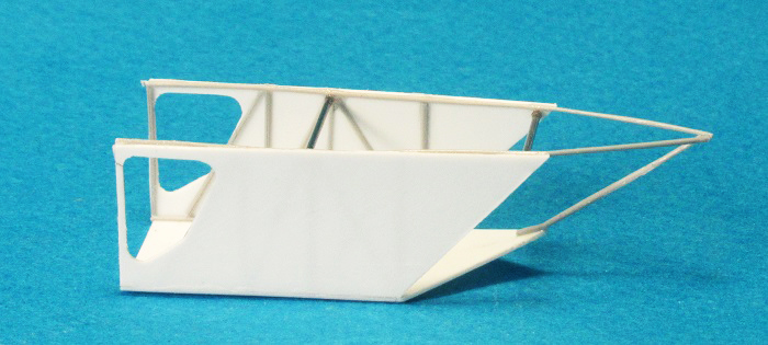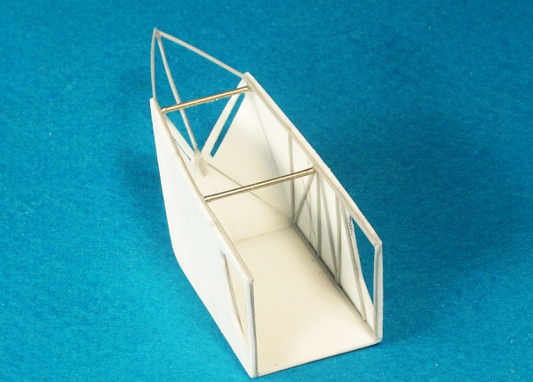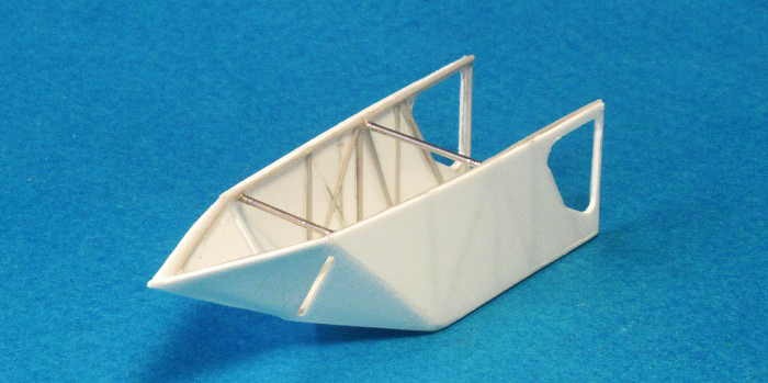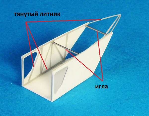 Имитировал тянутым литником каркас. Тем же литником склеил пространственную ферму кормовой части, а из иголок шприцов изготовил поперечные балки (для создания жёсткости конструкции).