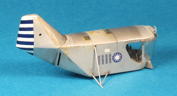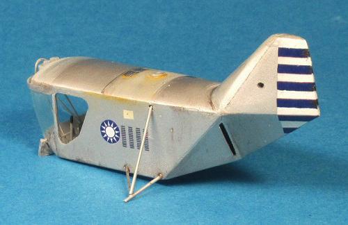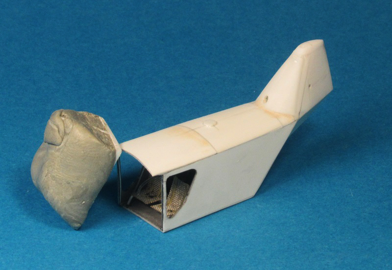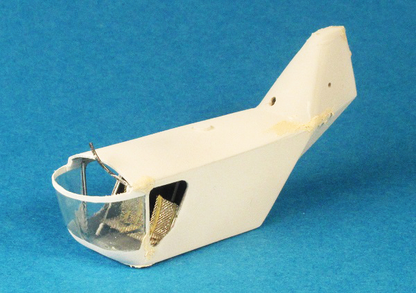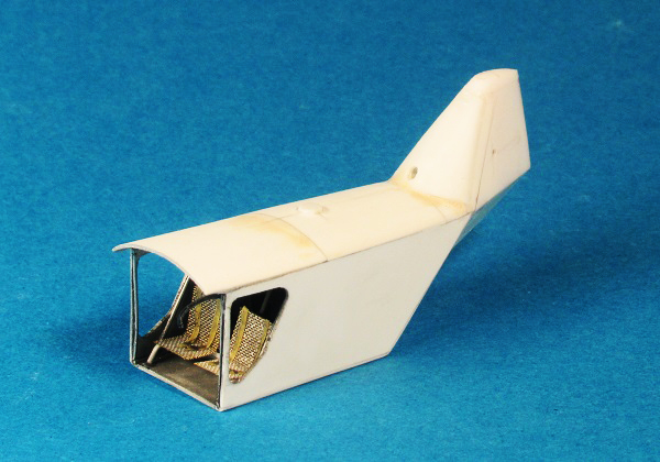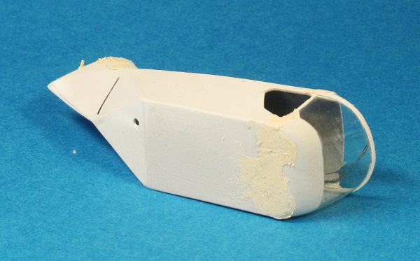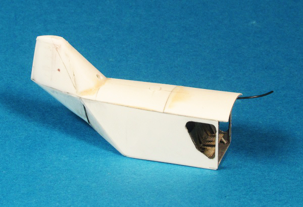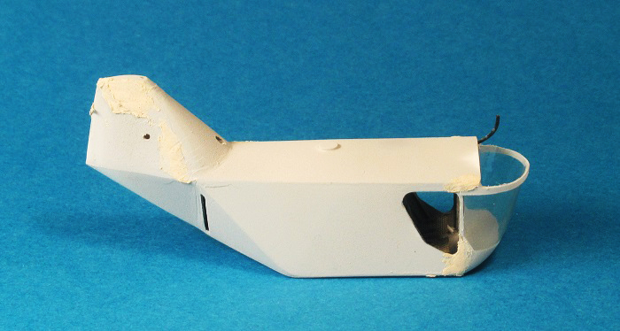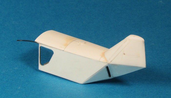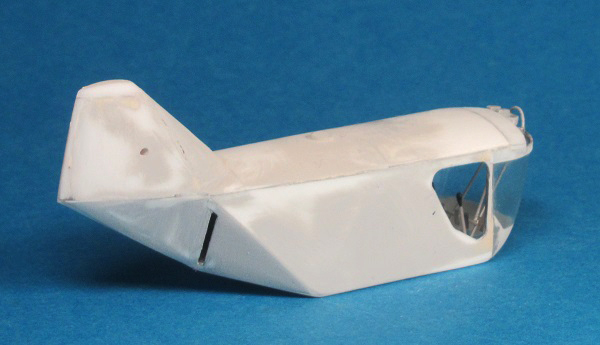 Хвостовая часть состоит из четырёх деталей: скруглённый носок из 1 мм  пластика, двух боковых панелей из того же пластика и  сверху кусочек пластика от досок для лепки. Всё на модельном клее. После просушки обработал.