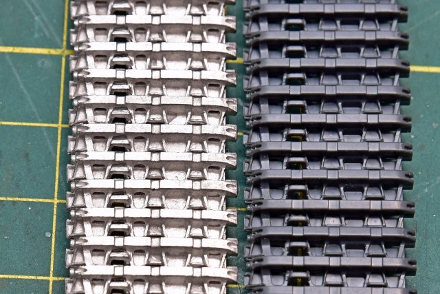 - "гуляние размеров": за эталон принята виниловая лента из коробки Драгона, как и положено, в ней 96 траков, по длине ей равно: 95,5 пластиковых траков, и прикол с металлом: 97 левых и 98 правых