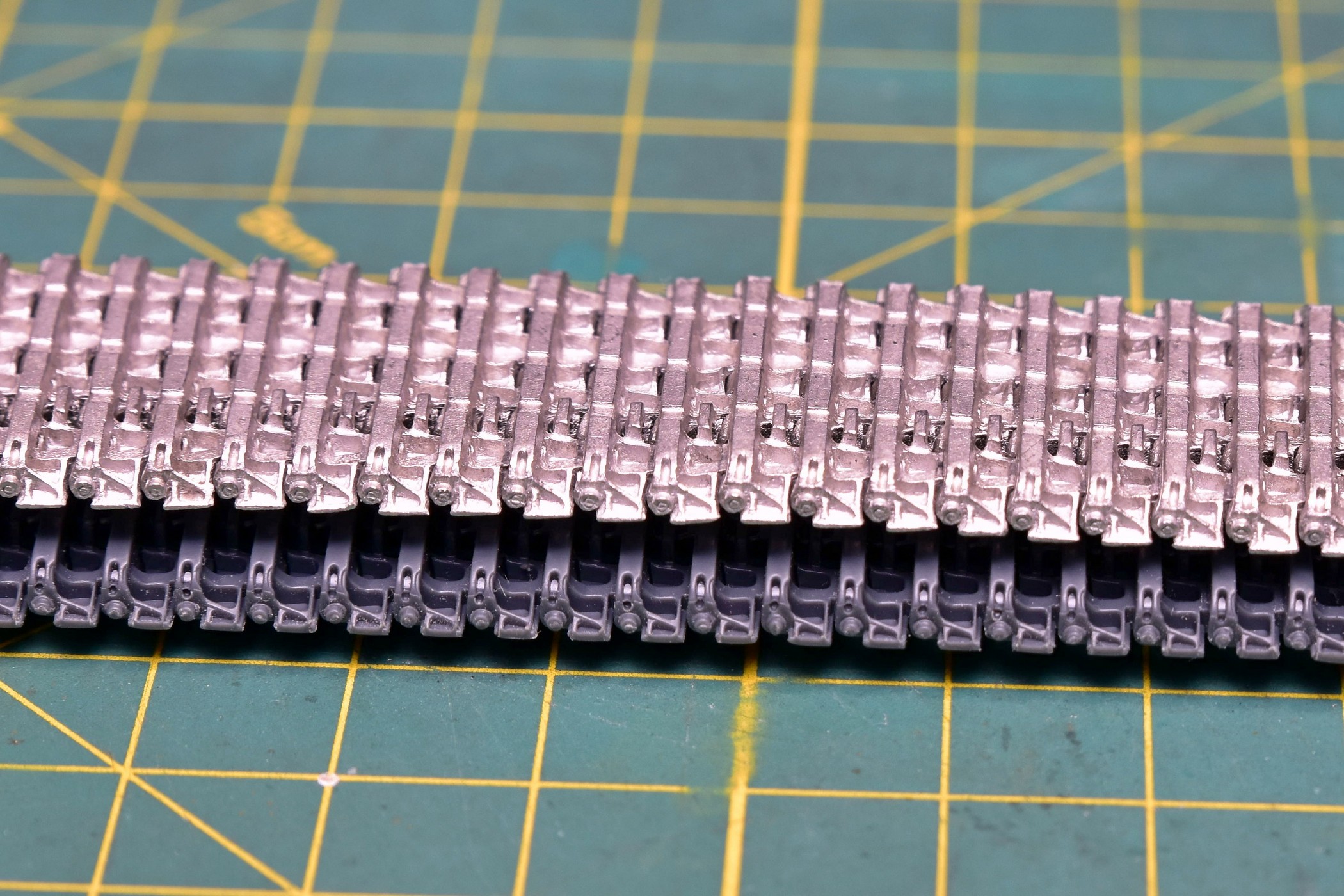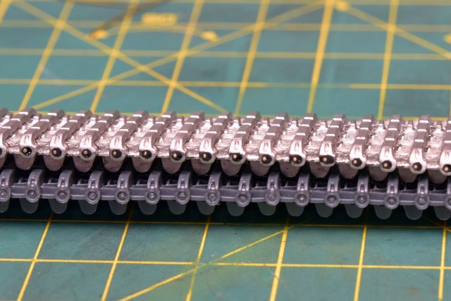 @Андрей написал:На сегодняшний день уже собраны в ленты гусеницы. Работать с наборными траками RFM мне понравилось. Хоть мороки и много: каждый трак состоит из 5 деталей, умножить на 96 траков ленты и на 2 ленты, получаем 960 деталюшек снятых с литников, зачищенных и аккуратно склеенных (чтобы не заблокировать подвижность), но всё же результат отличный. А объединив такие гусеницы с полностью рабочей подвеской в модели от Драгона, итог будет живописным.