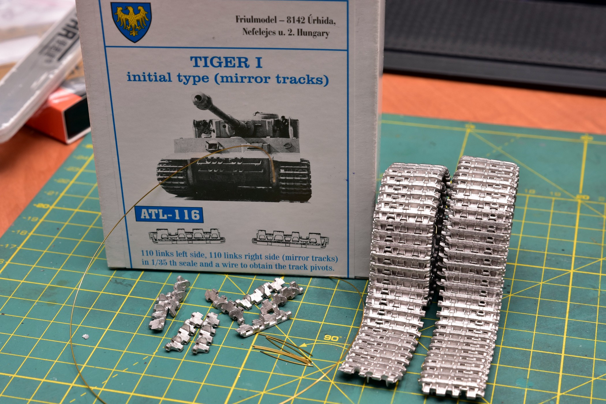 Соответственно, из-за редкости, очень немногие производители делают зеркальные траки для моделей ранних Тигров. Но я всё-таки нашёл Фриул и быстренько за 6 часов их собрал, благо, опыт позволяет оптимизировать и максимально ускорить процессы зачистки, сверления, сборки и шпаклевания.