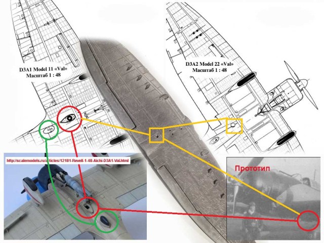- на модификации D3A1 люк для бомбового прицела (на рисунке обозначен красным цветом) имел другой вид, что хорошо просматривается на чертеже, на фотографии модели (взял на Скале), и на фотографии прототипа.