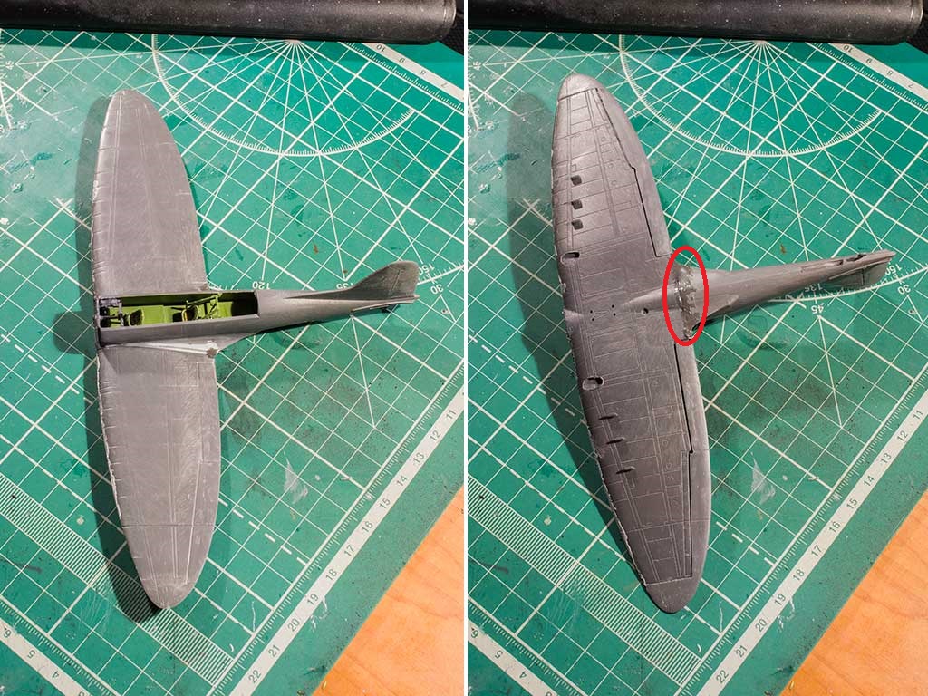 А у меня в фуджимовской модели в этом местепосле склейки почему-то была бОльшая ступенька,а верх крыла сложился хорошо,почти без щелей