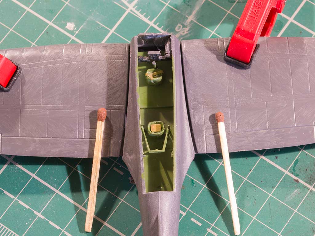 Наклеил полоски доширакпласта на места стыковки верхних половинок крыльев к фюзеляжу. Потом пришлось их подгонять по месту, так как после склеивания верхних и нижней частей крыльев, ширина щели стала не одинаковой по длине.