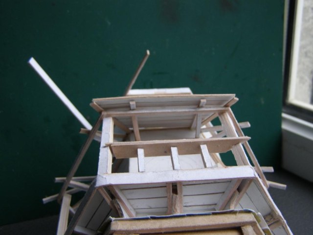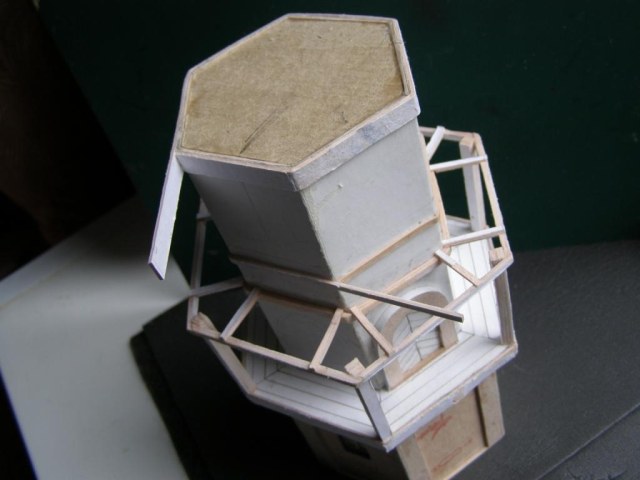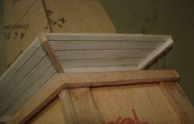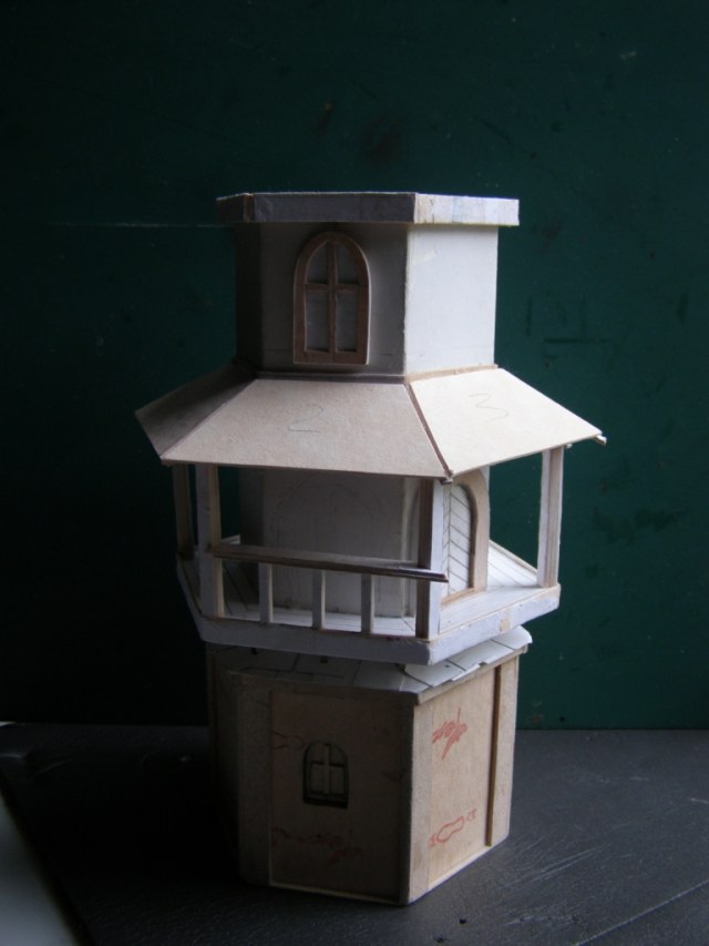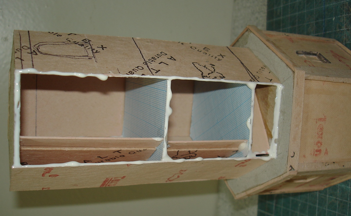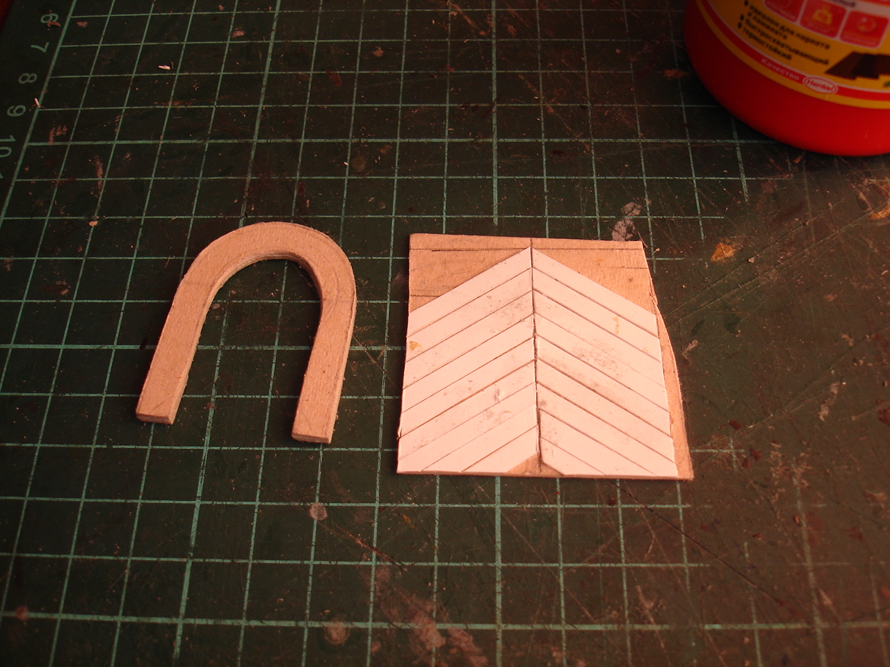 Затем обозначили упор верхней глухой части конструкции, тут применили медицинский шпатель из дерева. Благо этого добра там было - ешь НЕ ХОЧУ. Вклеили скажем так крышу и начали формировать еще одну конструкцию. пошли по другому. Просто сплошной заготовки не получалось.