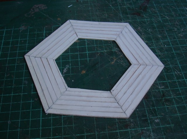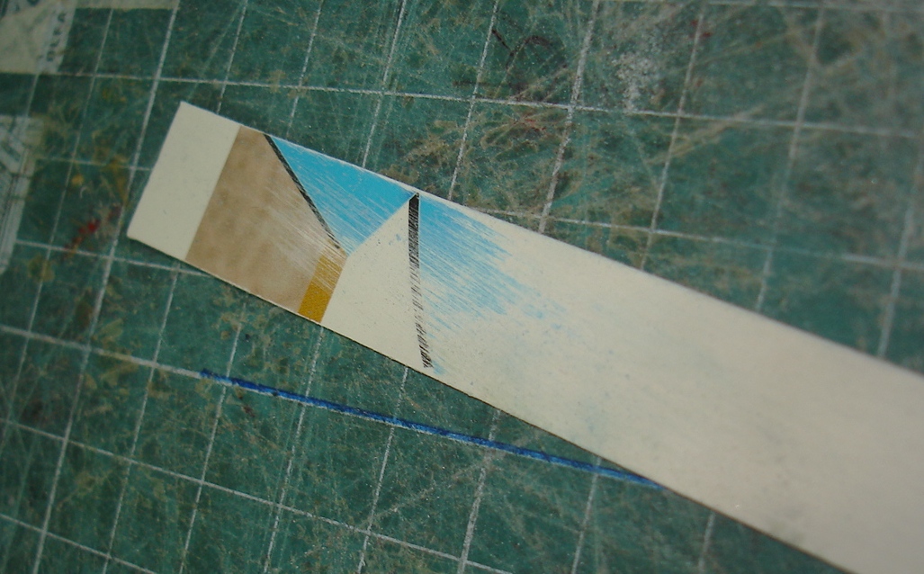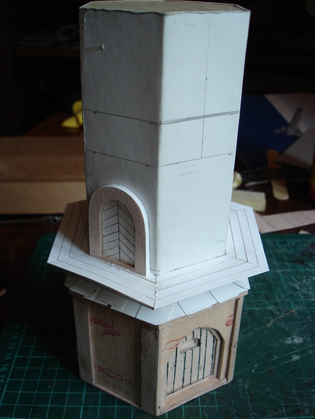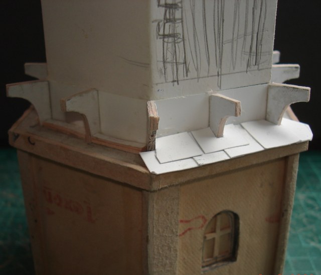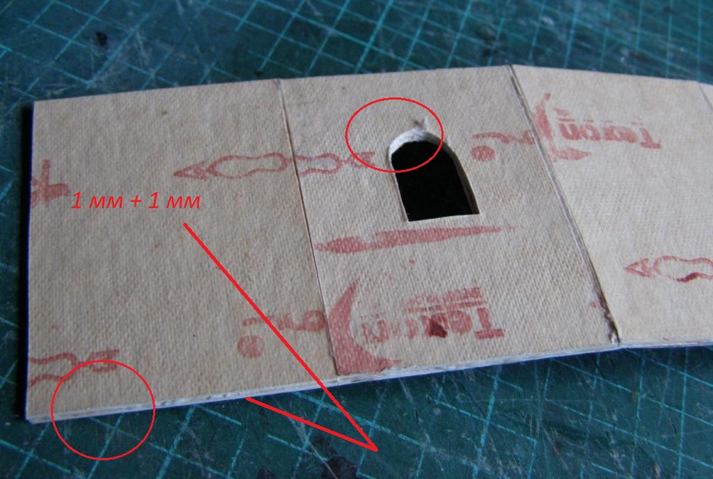 Обозначили высоту площадки от первой конструкции. Полоска 15 мм по высоте из обложки перекидного календаря. поверхность лощеная и клеится на ПВА плох, пришлось снимать блеск, а проще пройтись наждачной