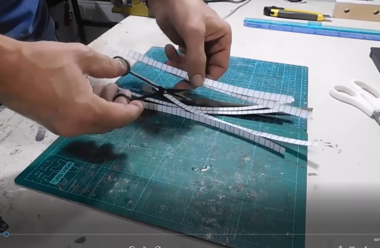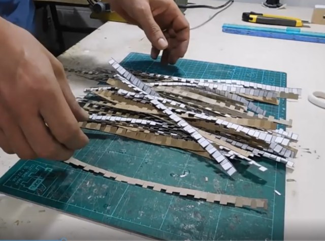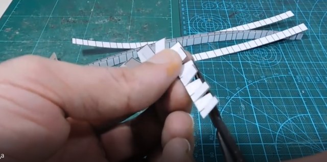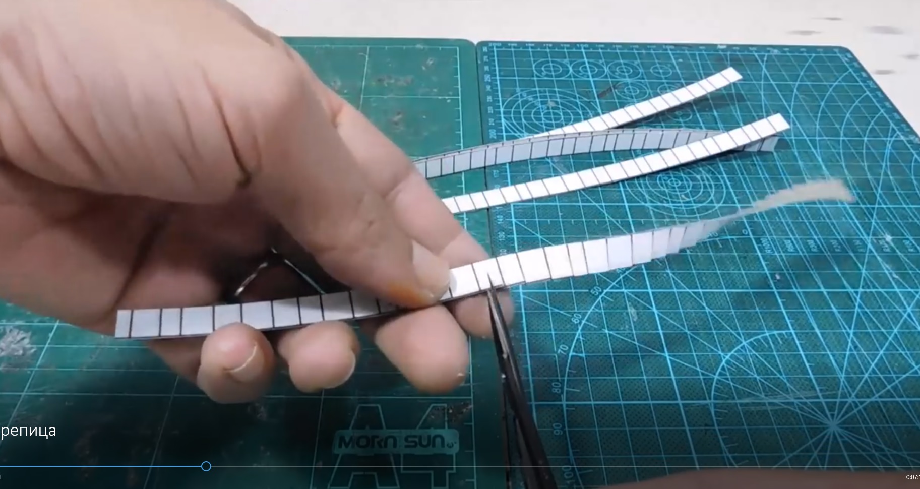 Полоску надрезают на равные части так чтобы полосой так и осталась, а затем эти части обрезают, какую побольше, какую поменьше. И рядами наклеивают.