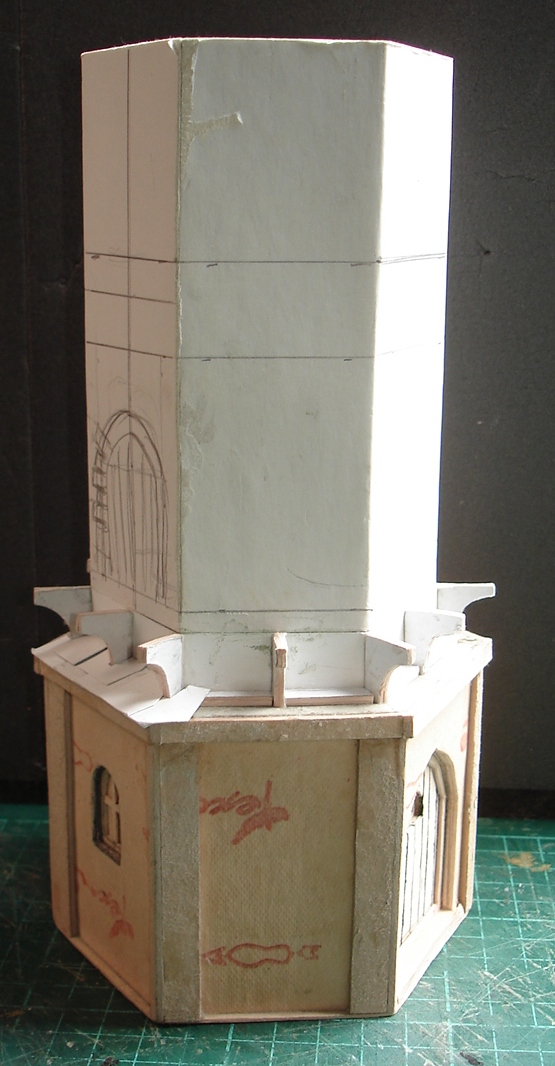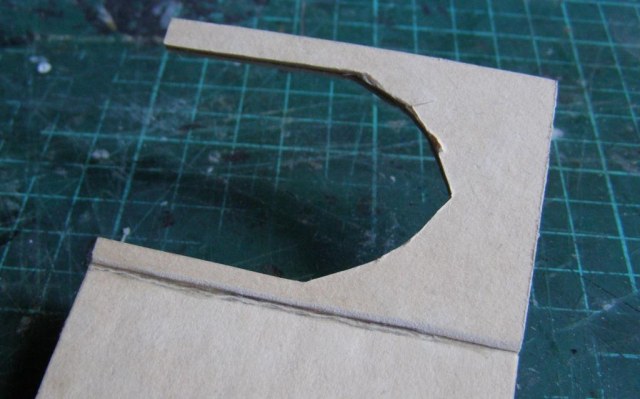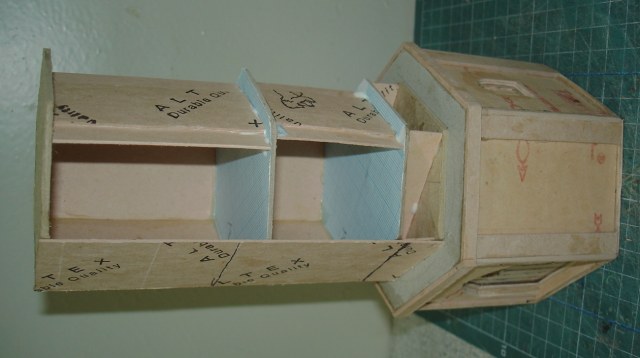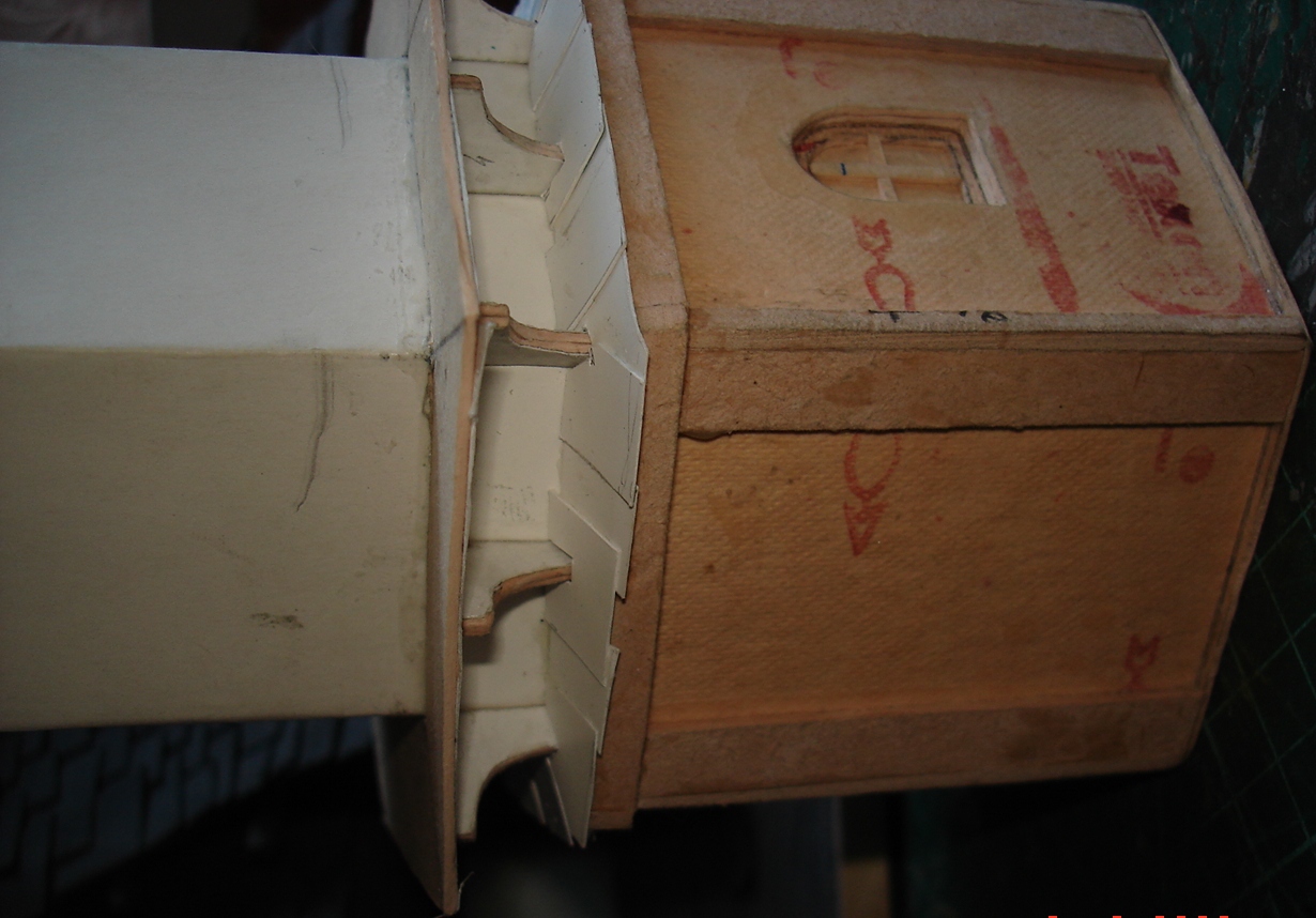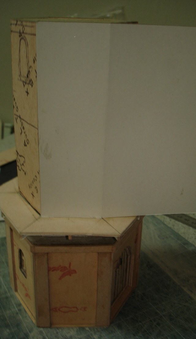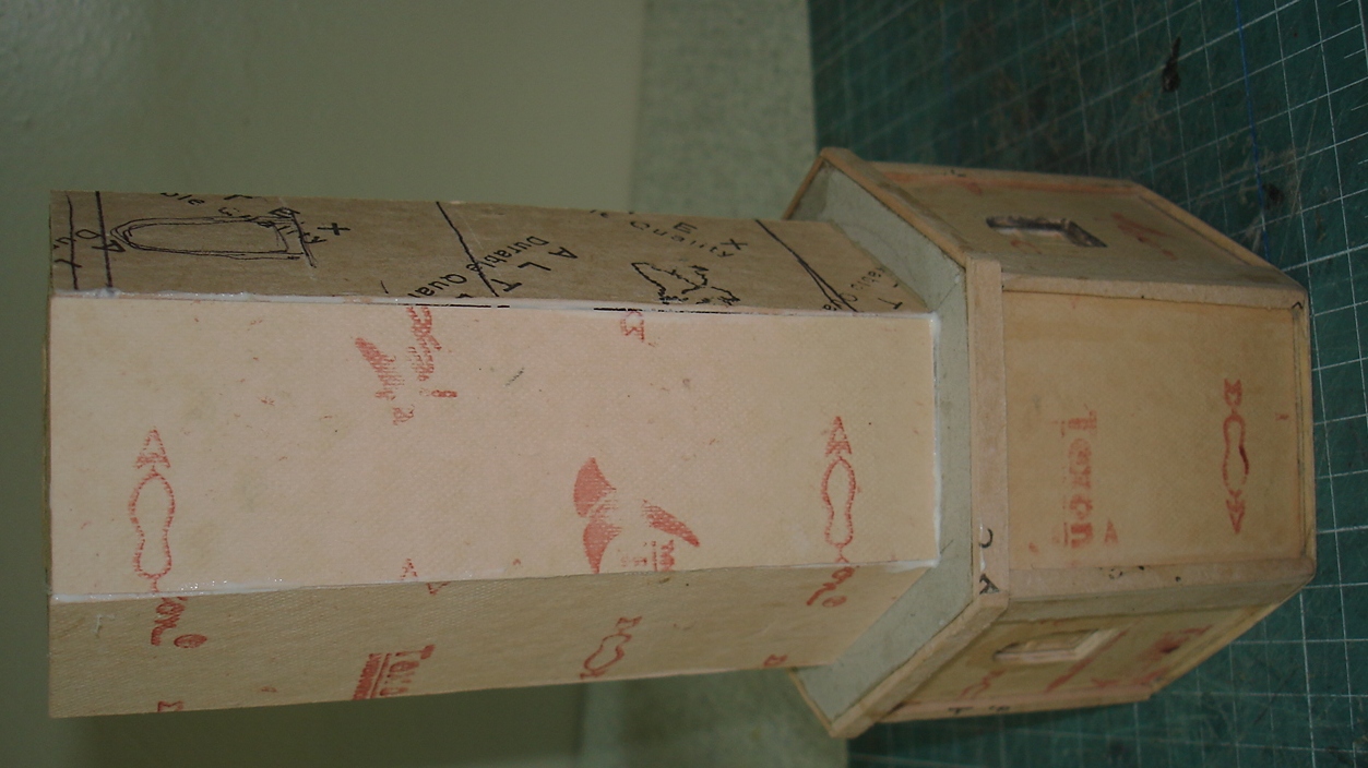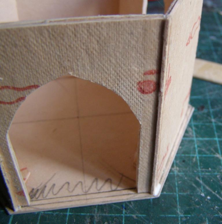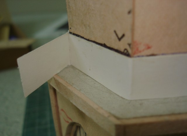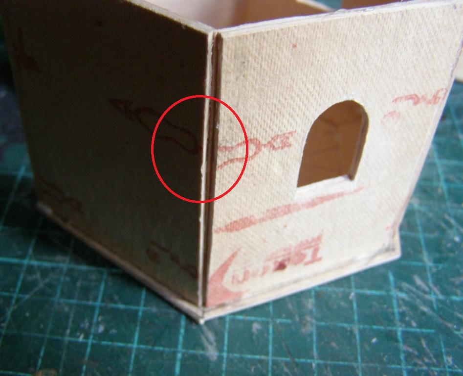 При складывании конструкции где был надрез образовалась щель, вклеил полоску, просохла срезал, затем попытался изобразить усиление, но если честно не очень. проще было бы просто по периметру выклевать всю конструкцию хотя бы одним листом обычной офисной бумагой а еще лучше ватман. А потом показывать грани....